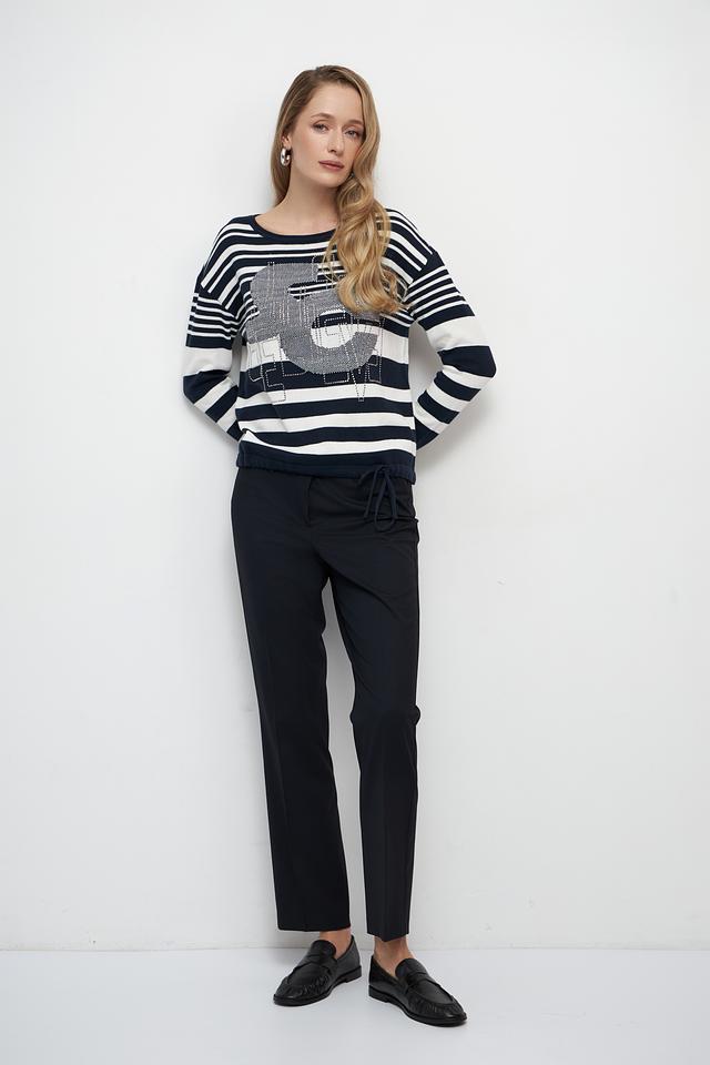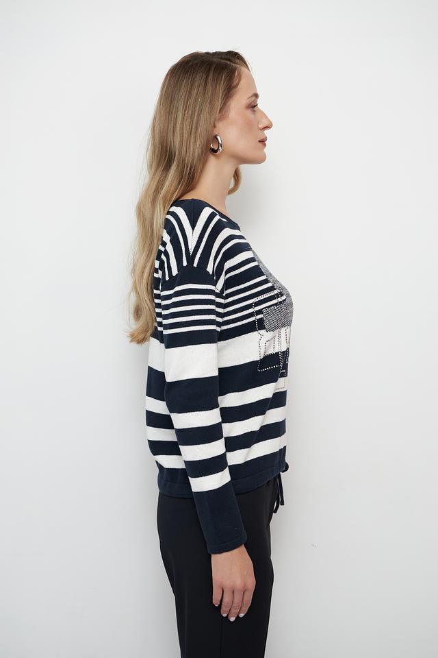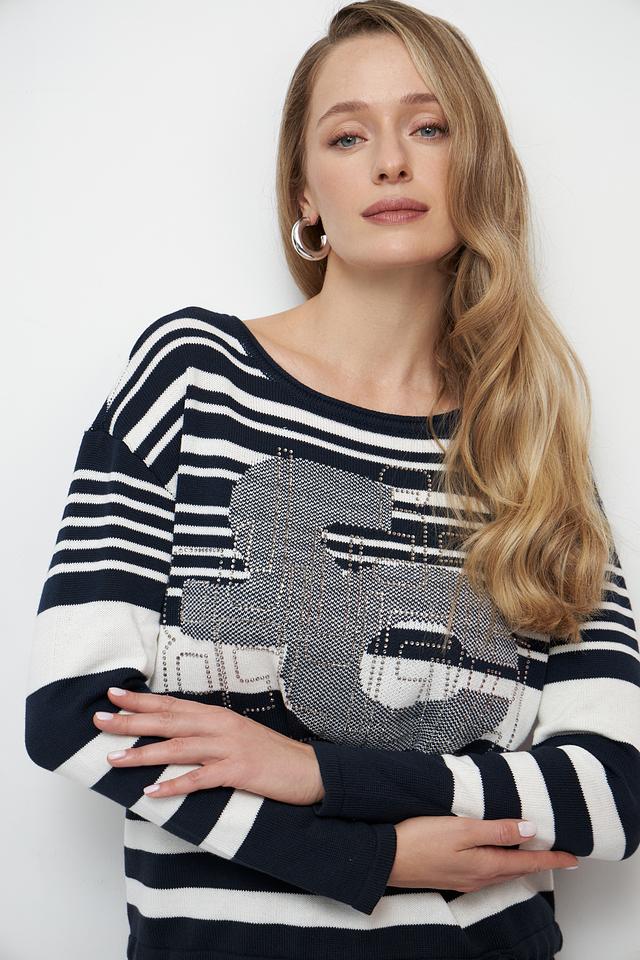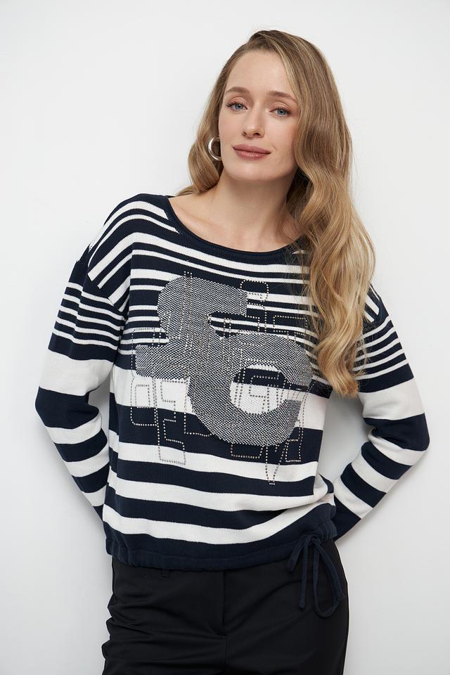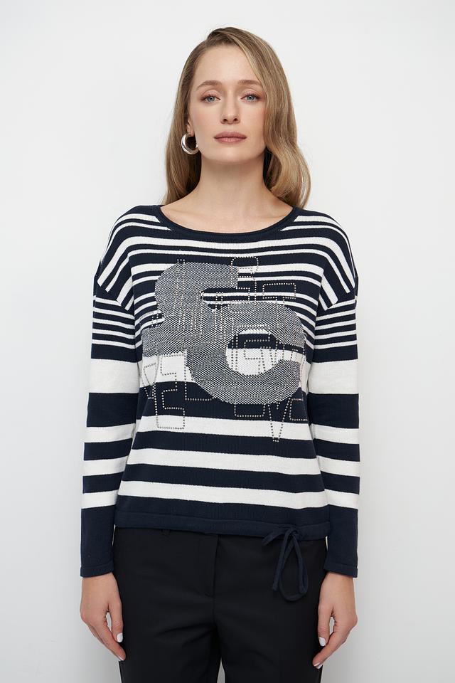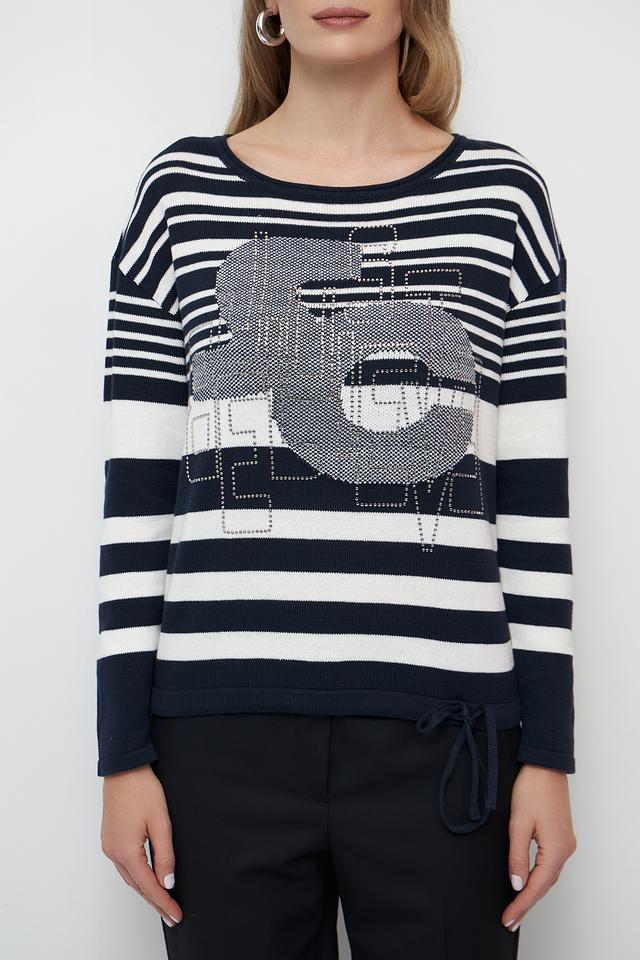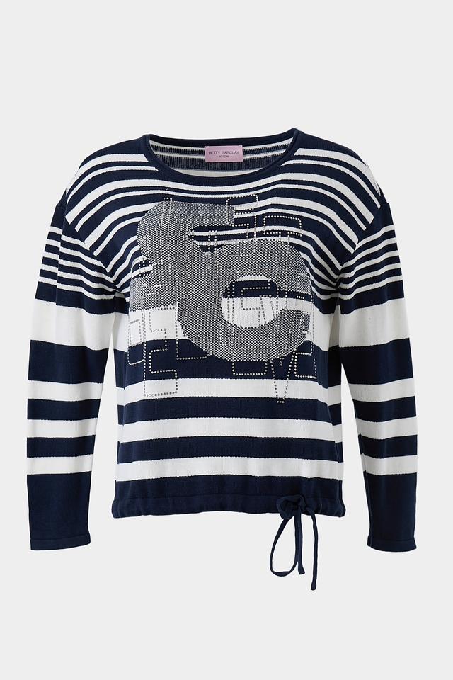 Женский пуловер Betty Barclay синего цвета с ярким принтом в виде лица. Модель выполнена в полоску и имеет удобный крой, идеально подходящий для повседневной носки. Состав: хлопок 100%