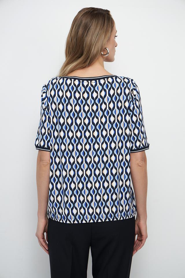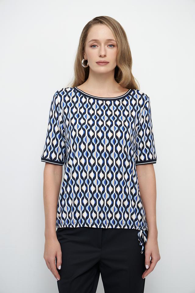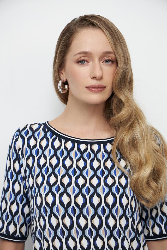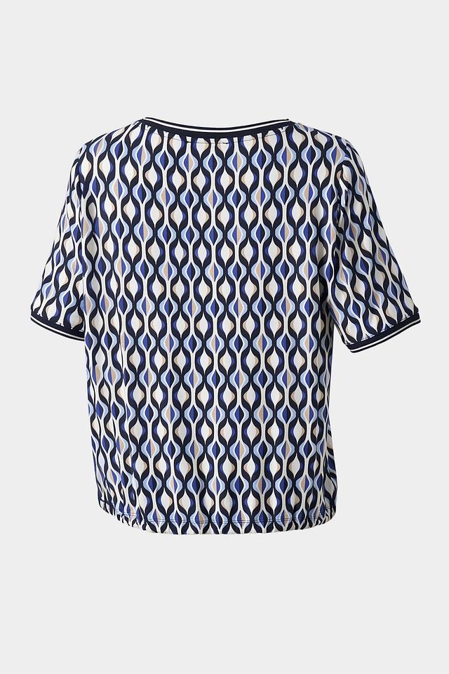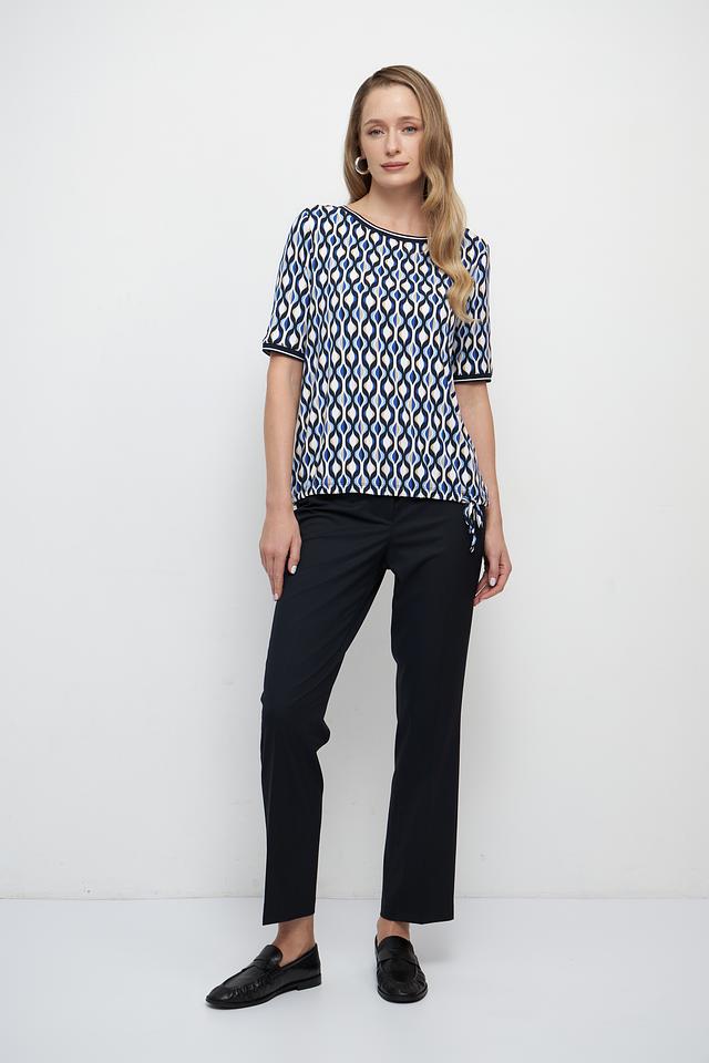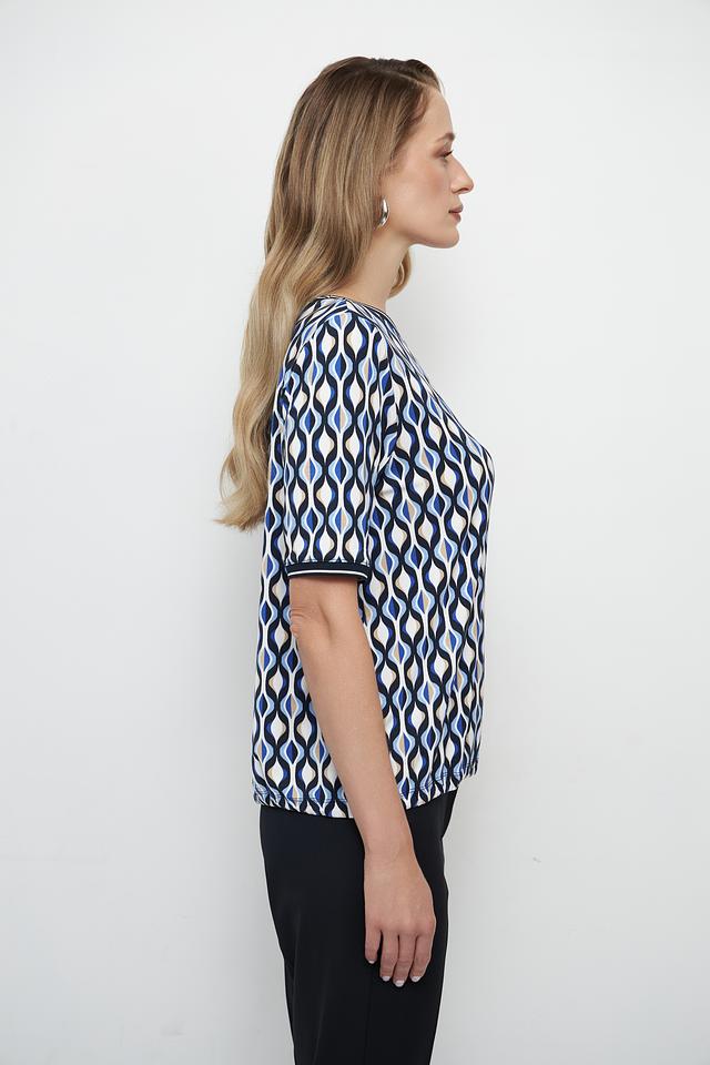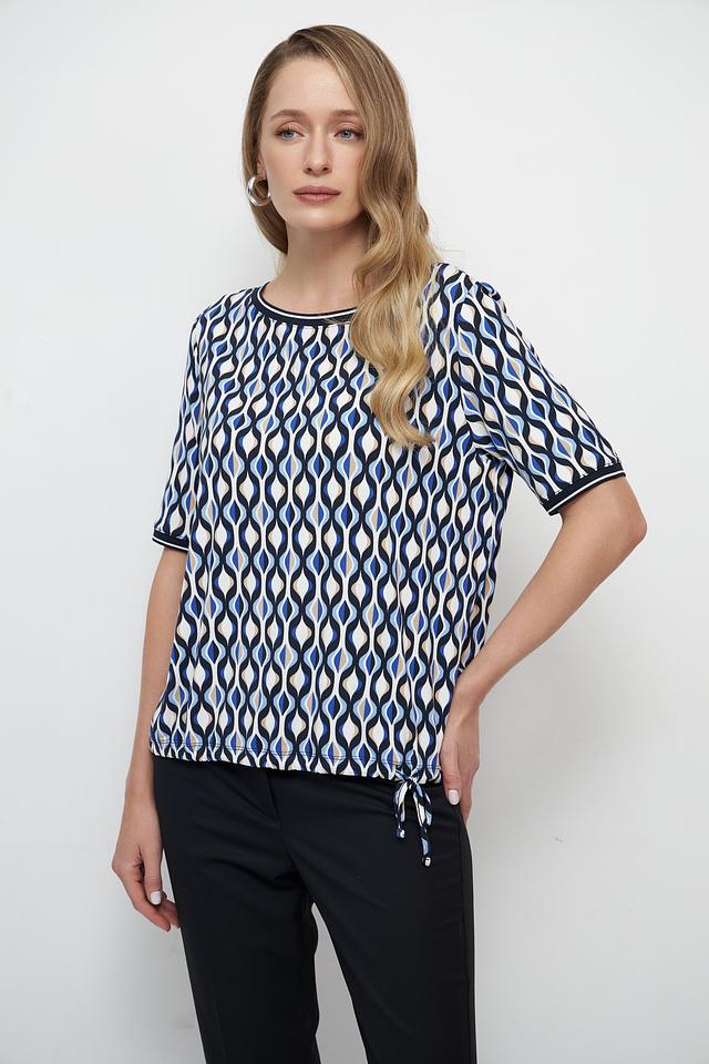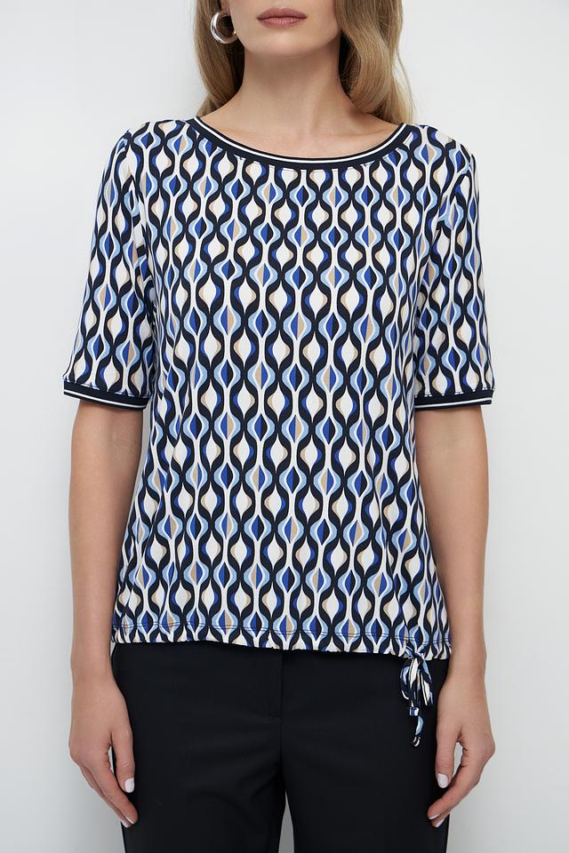 Особенностью данной модели является яркий геометрический принт в синих и белых тонах, который придает блузе оригинальность и выразительность. Круглый вырез горловины и короткие рукава делают ее подходящей для теплой погоды.