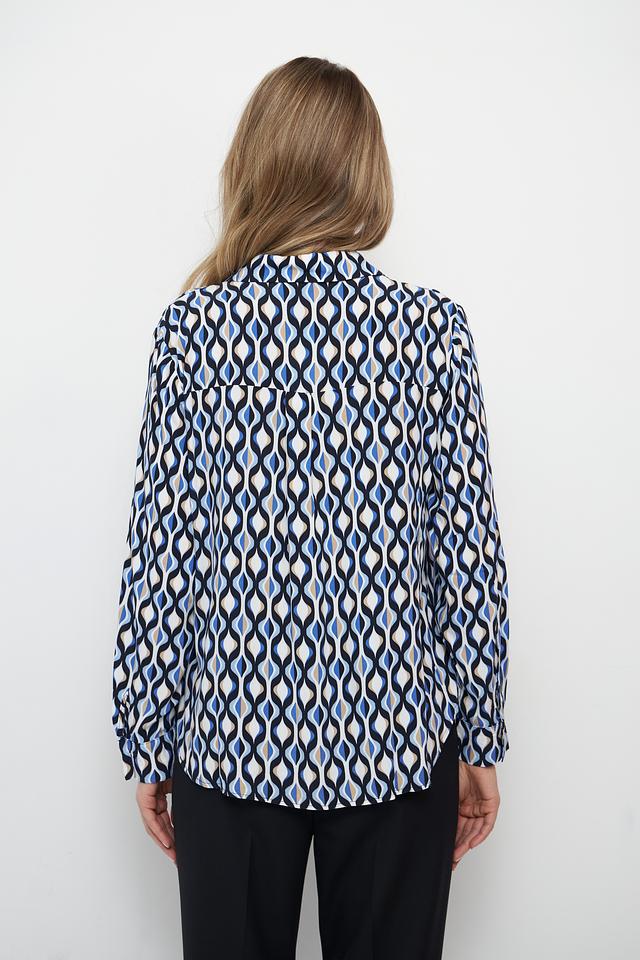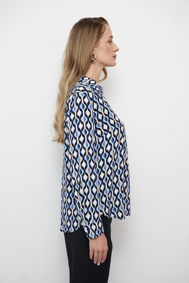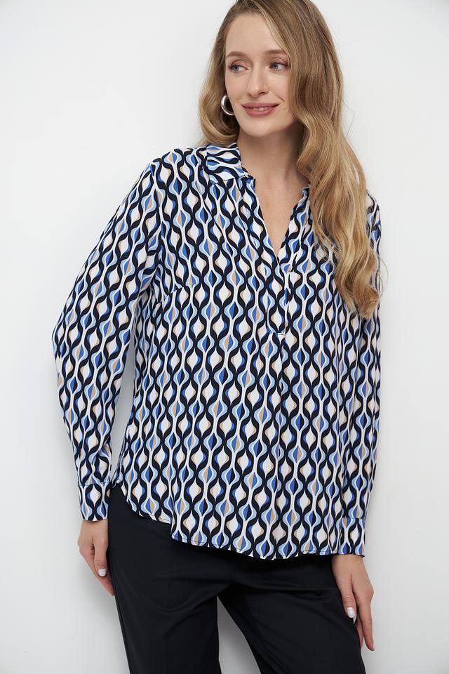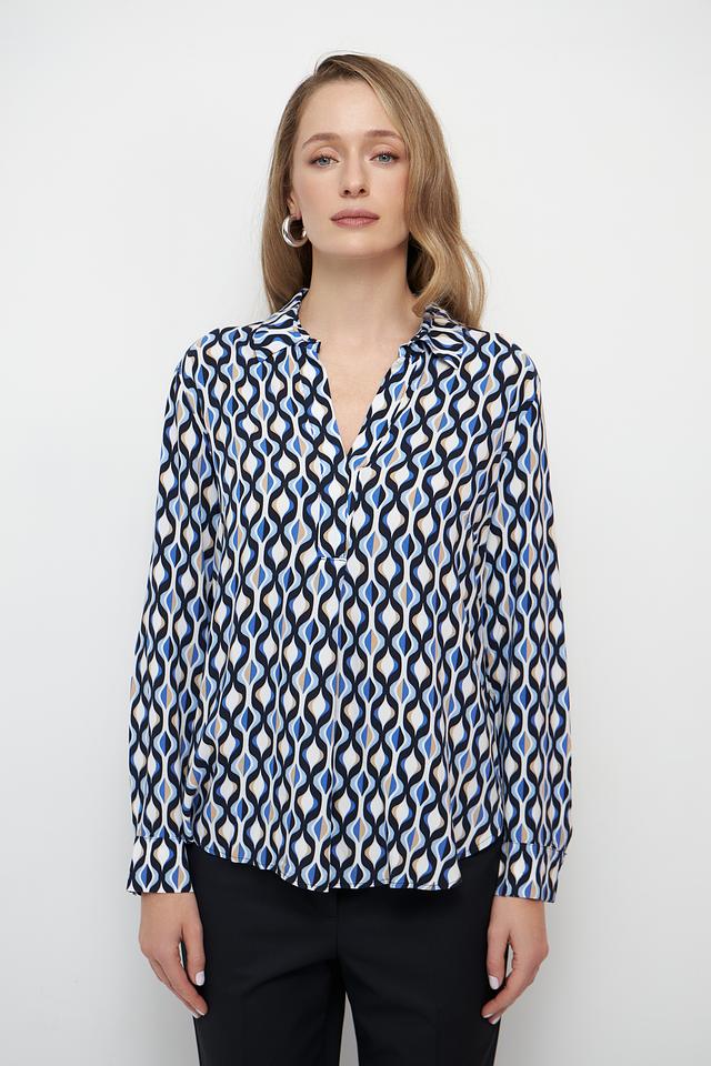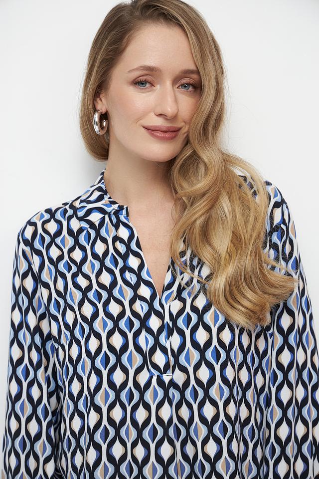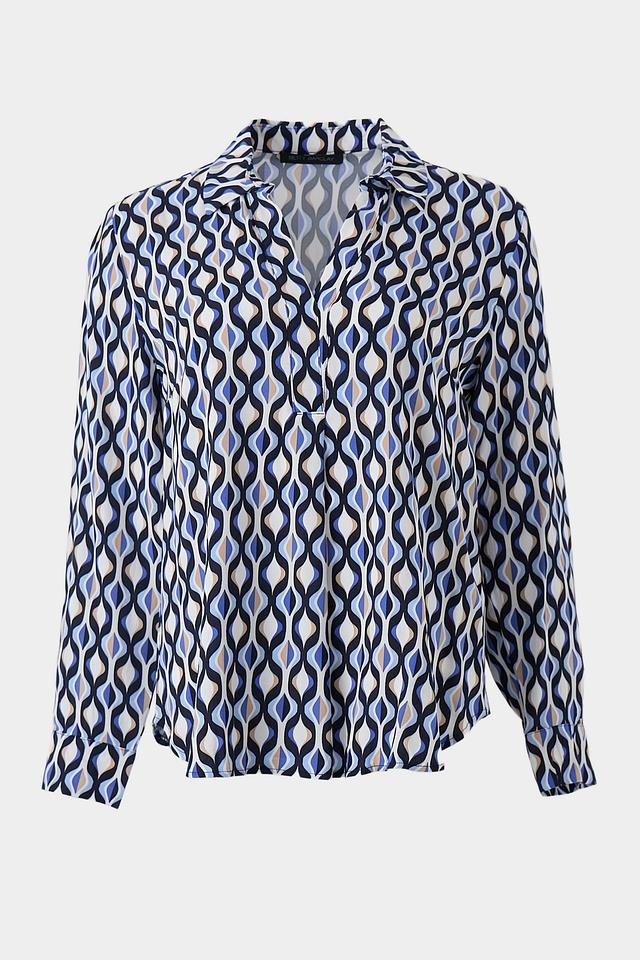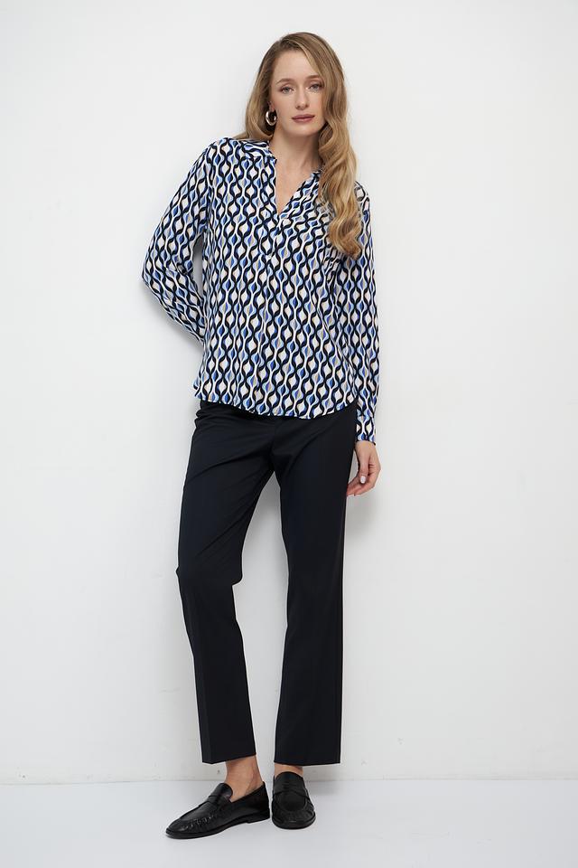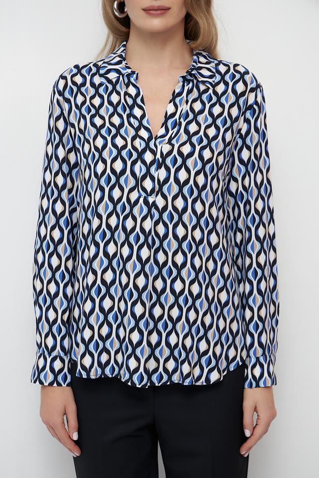 Основной цвет блузы – белый, но ее украшает яркий и динамичный геометрический принт, выполненный в синих, черных и бежевых тонах. V-образный вырез и длинные рукава придают блузе классический вид, а свободный крой обеспечивает свободу движений.