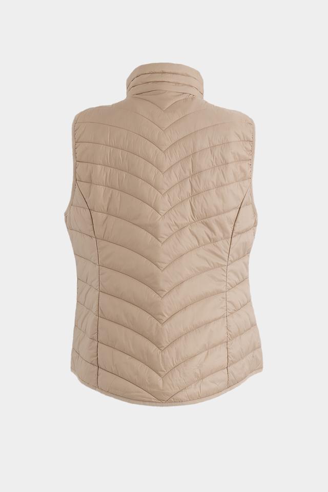 Жилет имеет стеганую текстуру, которая придает ему современный вид. Застежка-молния позволяет легко надевать и снимать жилет, а воротник-стойка защищает от ветра.