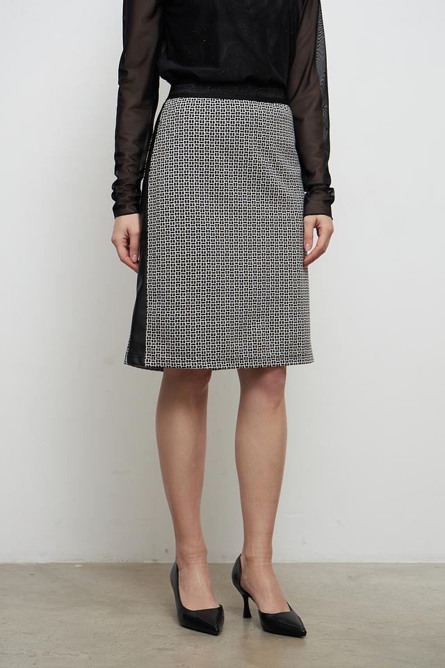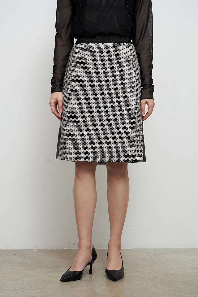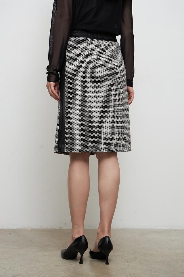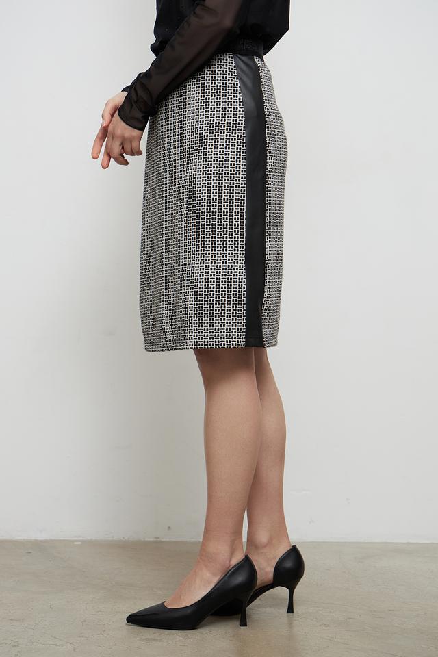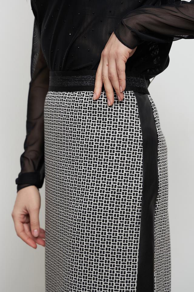 Дизайн юбки выполнен в черно-белой цветовой гамме с геометрическим принтом в клетку. Оригинальную деталь добавляет черная кожаная вставка сбоку. Эта юбка идеально подойдет для создания как повседневных, так и более формальных образов.