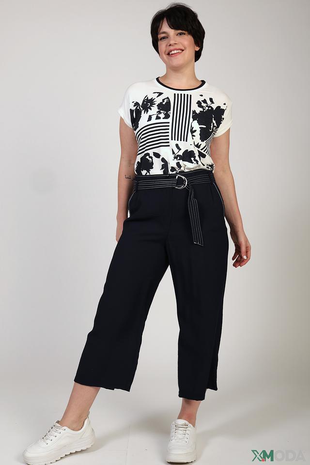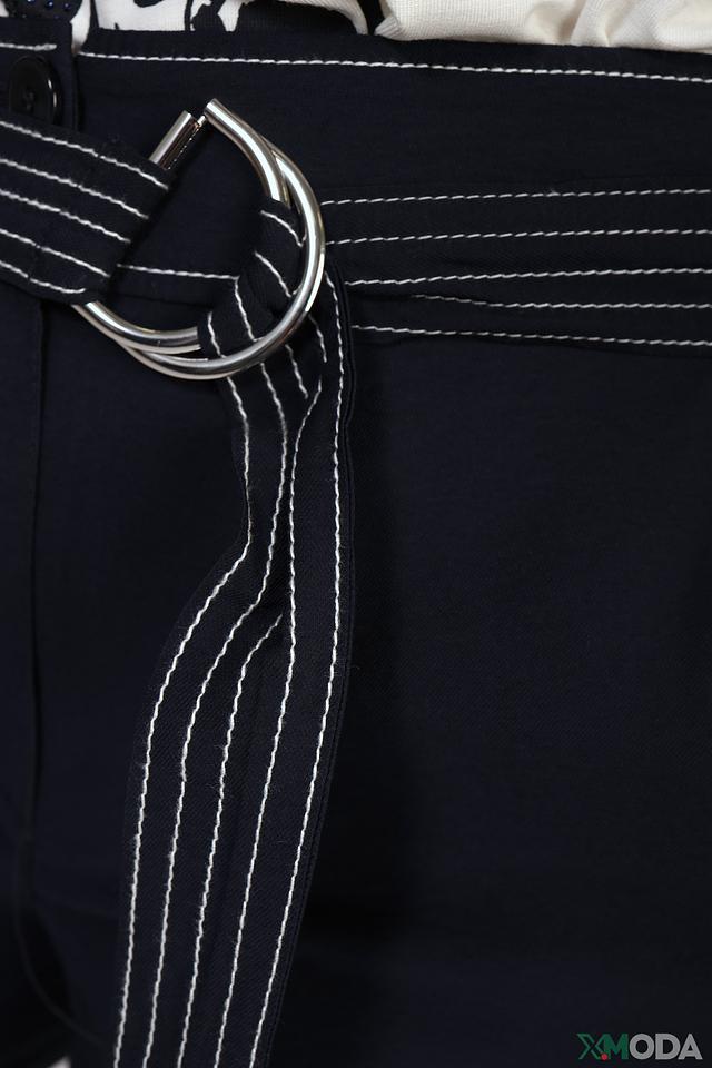 Капри имеют прямой крой и длину до середины икры, что делает их универсальным выбором для создания как повседневных, так и более нарядных образов. Особенностью модели является широкий пояс с декоративной отделкой в виде белых полос и стильной металлической пряжки.