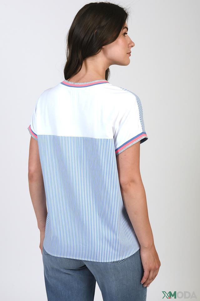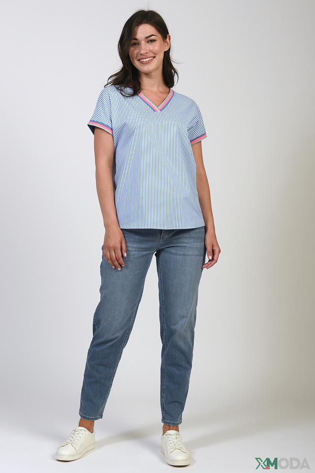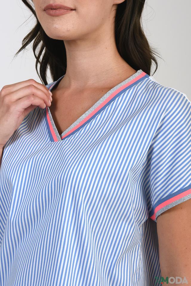 Голубая блуза Betty Barclay в полоску с V-образным вырезом и короткими рукавами. Модель выполнена из хлопка с добавлением полиамида и эластана, что обеспечивает комфорт и удобство в носке. Состав: хлопок 74%, полиамид 23%, эластан 3%