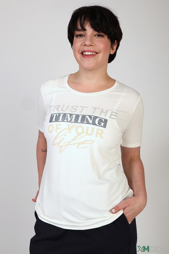 Белая футболка Betty Barclay с оригинальным принтом "Trust the timing of your life". Изготовлена из мягкой вискозы с добавлением эластана для комфорта и хорошей посадки. Идеальный выбор для создания повседневного образа. Состав: вискоза 95%, эластан 5%