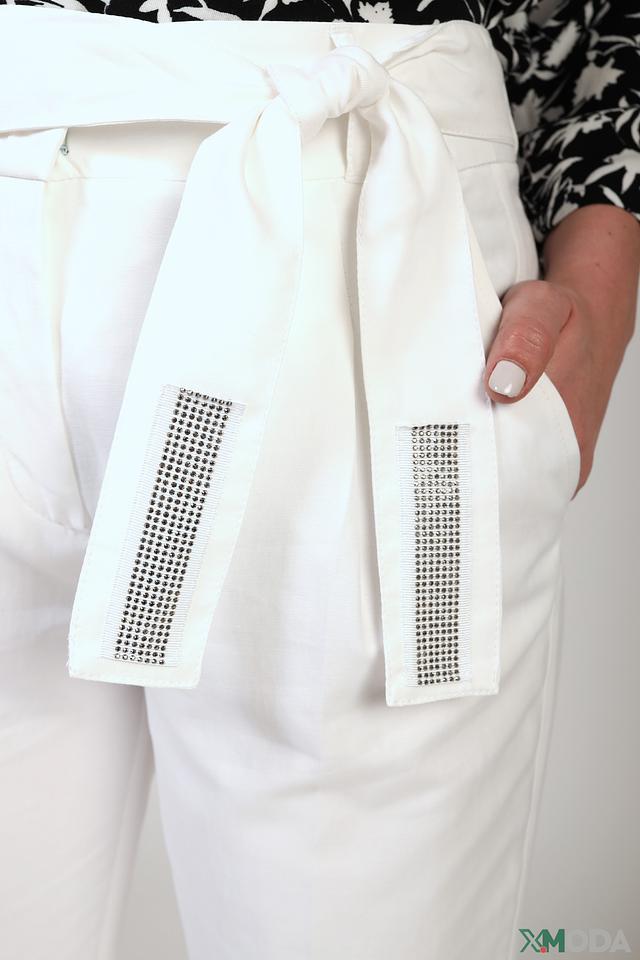 Капри имеют прямой крой и длину до середины икры, что обеспечивает комфорт и свободу движений. Пояс с завязками и декоративной отделкой в виде страз добавляет образу женственности и элегантности.