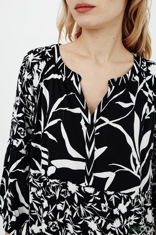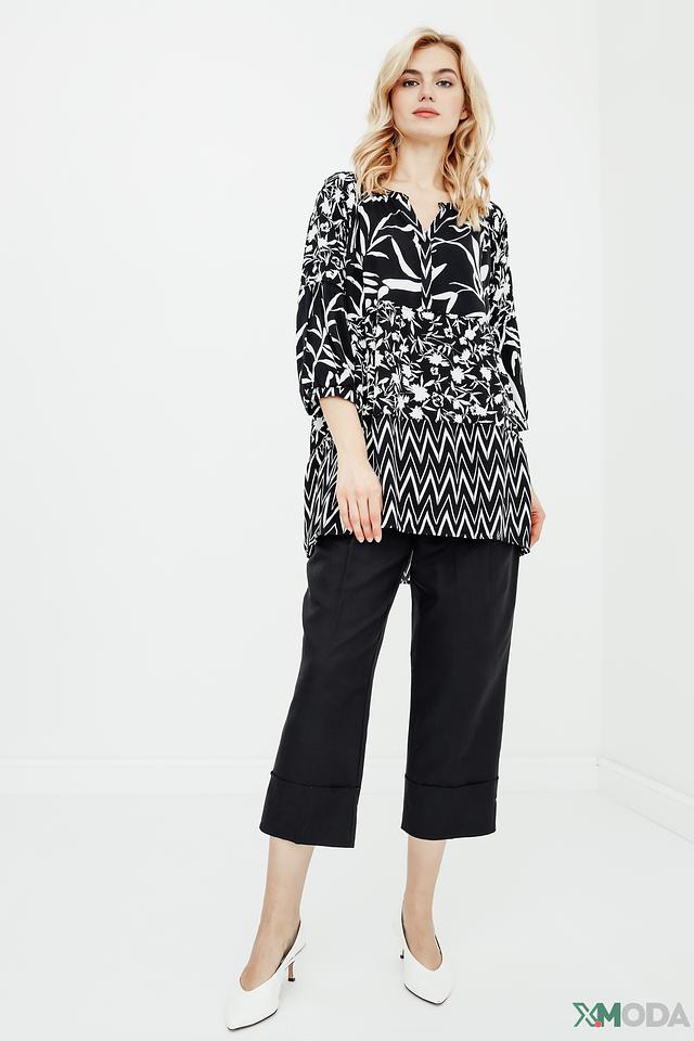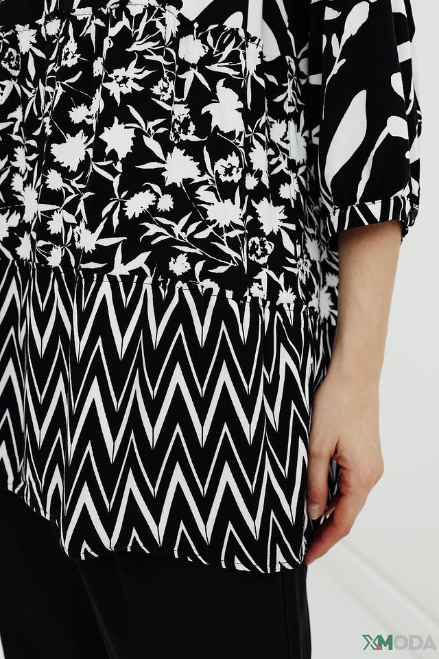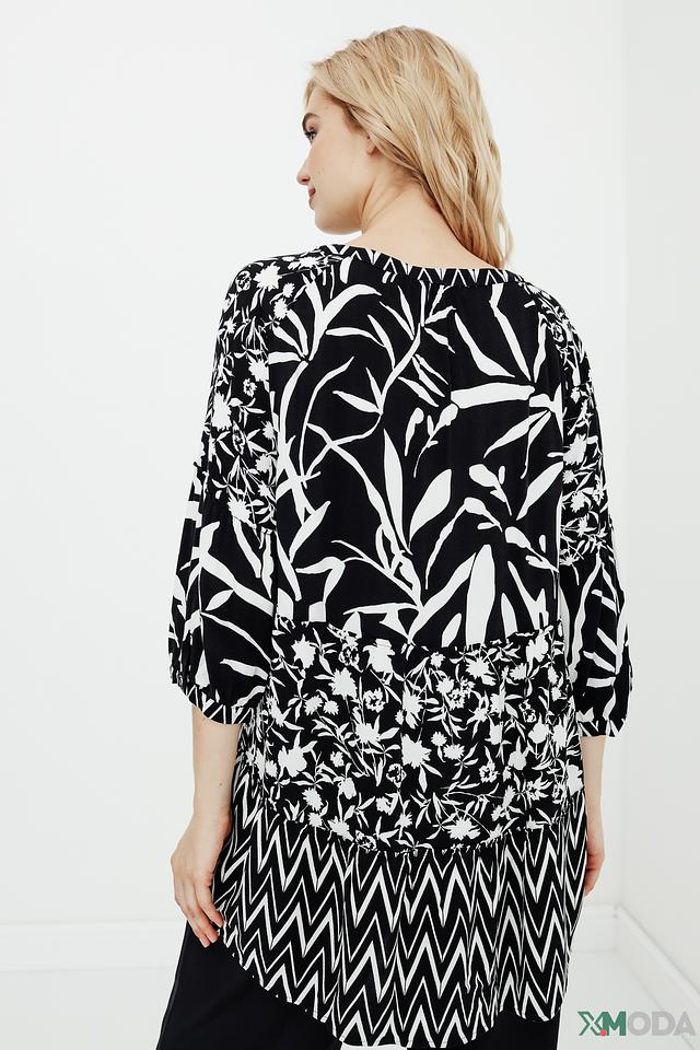 Блуза Betty Barclay чёрно-белого цвета с оригинальным цветочным и геометрическим принтом. Модель выполнена из мягкой вискозы, имеет V-образный вырез и рукава 3/4. Состав: вискоза 100%