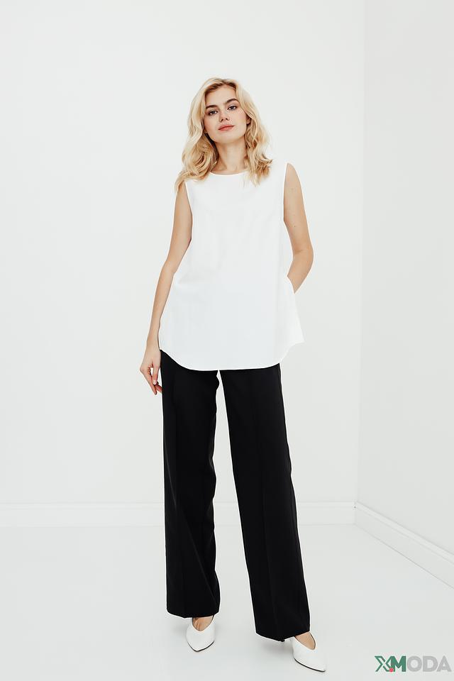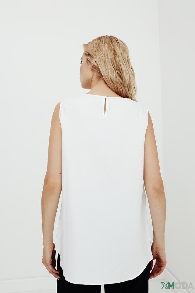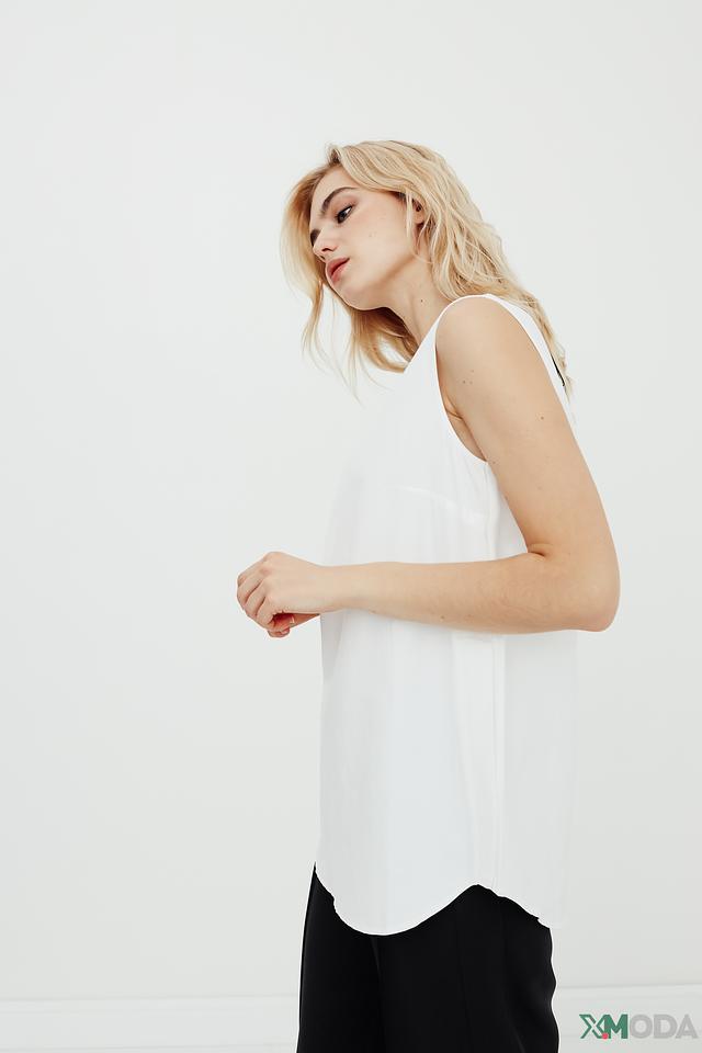 Топ имеет свободный крой, который не сковывает движений, и лаконичный дизайн без рукавов. Вырез горловины округлый, а спинка дополнена небольшим разрезом. Асимметричный подол придает модели оригинальность.
