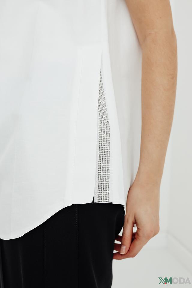 Небольшой декоративный элемент с серебристой вышивкой расположен сбоку топа, добавляя изысканности образу. Этот топ прекрасно сочетается с брюками, юбками и джинсами, позволяя создавать разнообразные стильные образы.