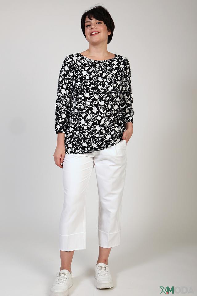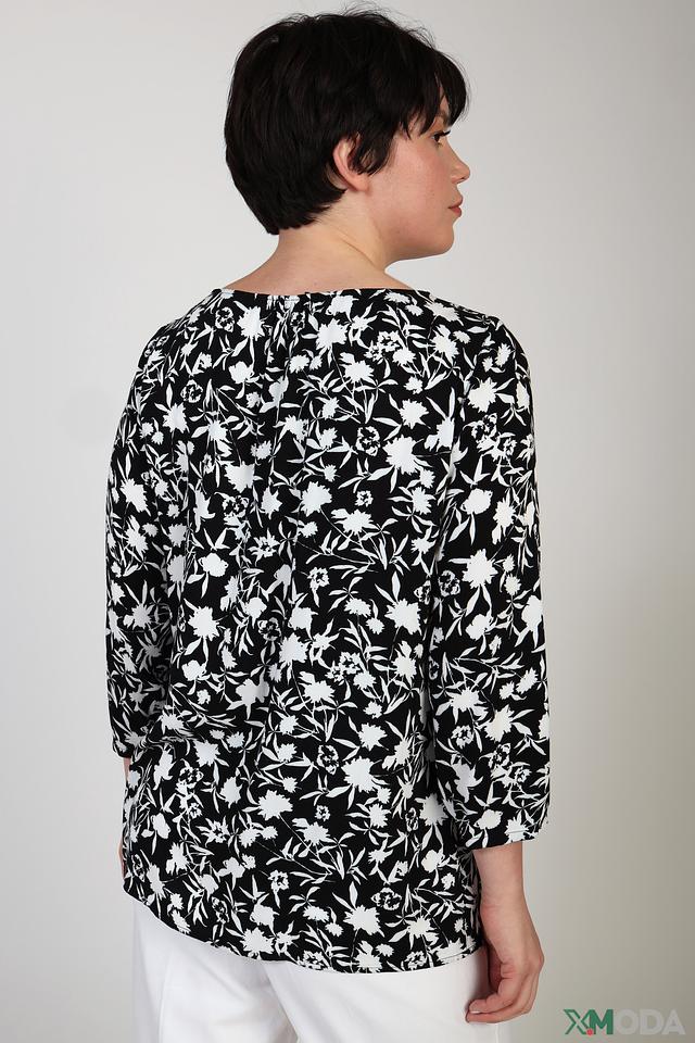 Основной цвет блузы – чёрный, а ярким акцентом является белоснежный цветочный принт, который добавляет свежести и лёгкости. Такой рисунок делает блузу универсальной и подходящей для создания различных образов – от повседневных до более нарядных.