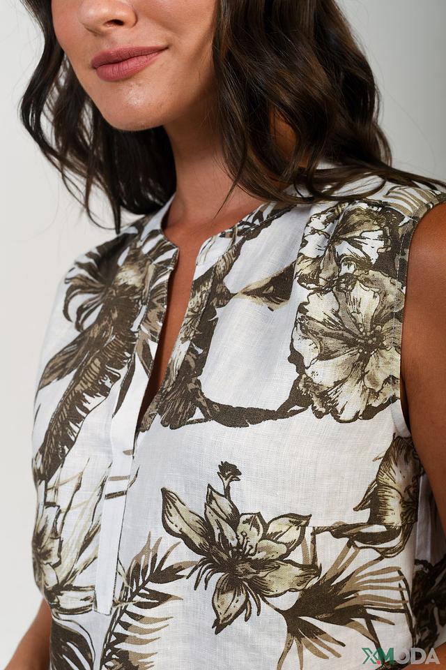Этот стильный топ от Betty Barclay выполнен из натурального льна, что делает его идеальным выбором для жаркой погоды. Преобладающий цвет топа – белый, украшенный выразительным цветочным принтом в оттенках коричневого и оливкового.