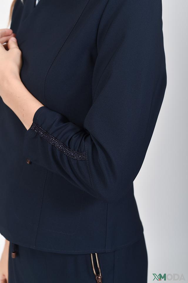 Модель имеет приталенный силуэт, который подчеркивает фигуру, и длину до бедер. Рукава 3/4 с декоративной отделкой в виде небольших страз придают жакету изысканность.
