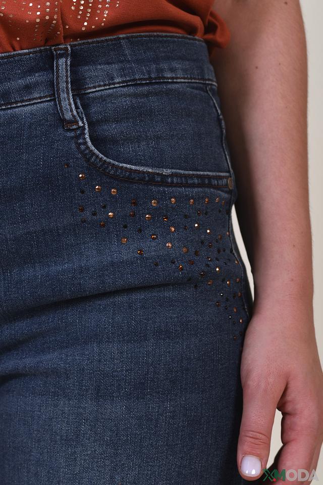 Капри имеют классический синий цвет и прямой крой. Отличительной особенностью является декоративная вышивка с использованием золотистых нитей, расположенная на передних карманах и по бокам брюк, что придает им изысканный вид.