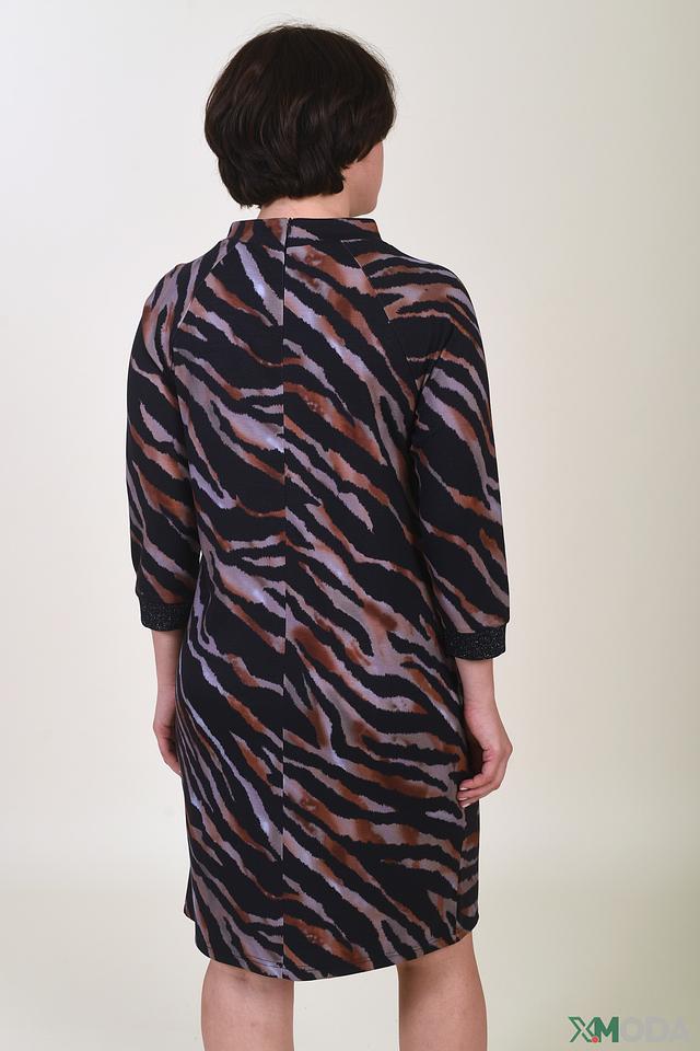 Это стильное платье от Betty Barclay выполнено в черном цвете и украшено ярким принтом в виде полос "зебра", выполненным в коричневых и серо-коричневых оттенках. Платье имеет приталенный силуэт, который подчеркивает фигуру, и длину до колена.