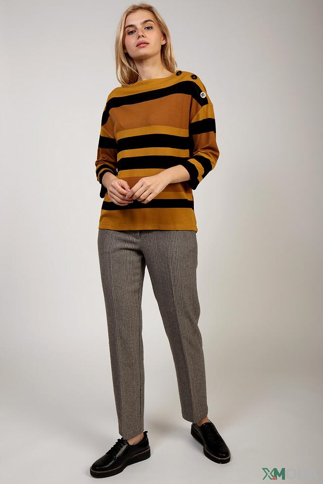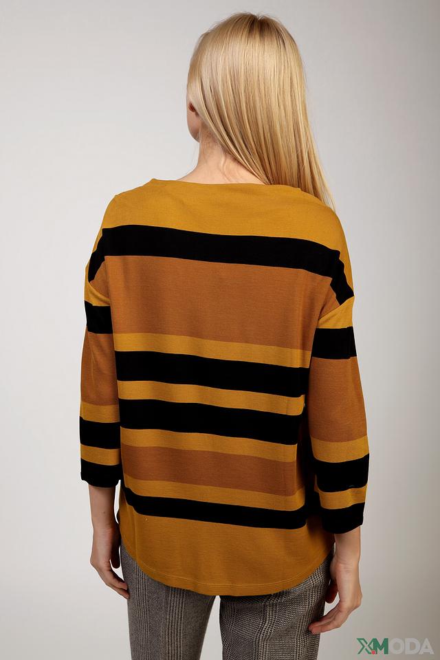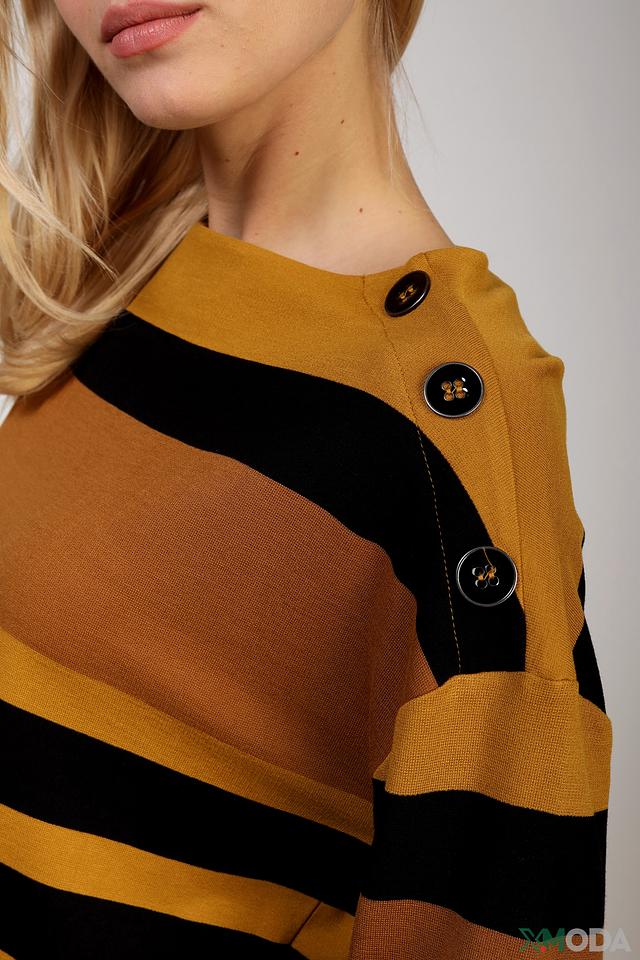 Этот пуловер от Betty Barclay станет отличным дополнением к вашему гардеробу. Модель выполнена в горчичном цвете с широкими черными полосами, создающими контрастный и динамичный образ.
