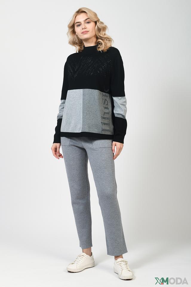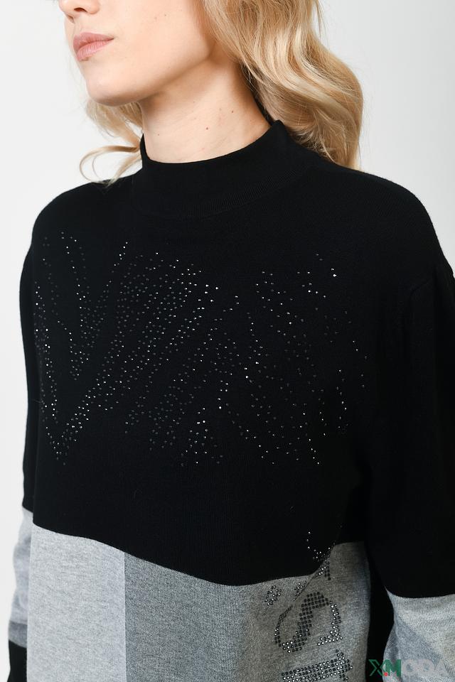 Передняя часть пуловера украшена россыпью страз, придающих изделию праздничный и элегантный вид. Цветовой блок в виде серого вставки добавляет оригинальности и динамики. Вырез горловины – стойка, что делает модель более современной.