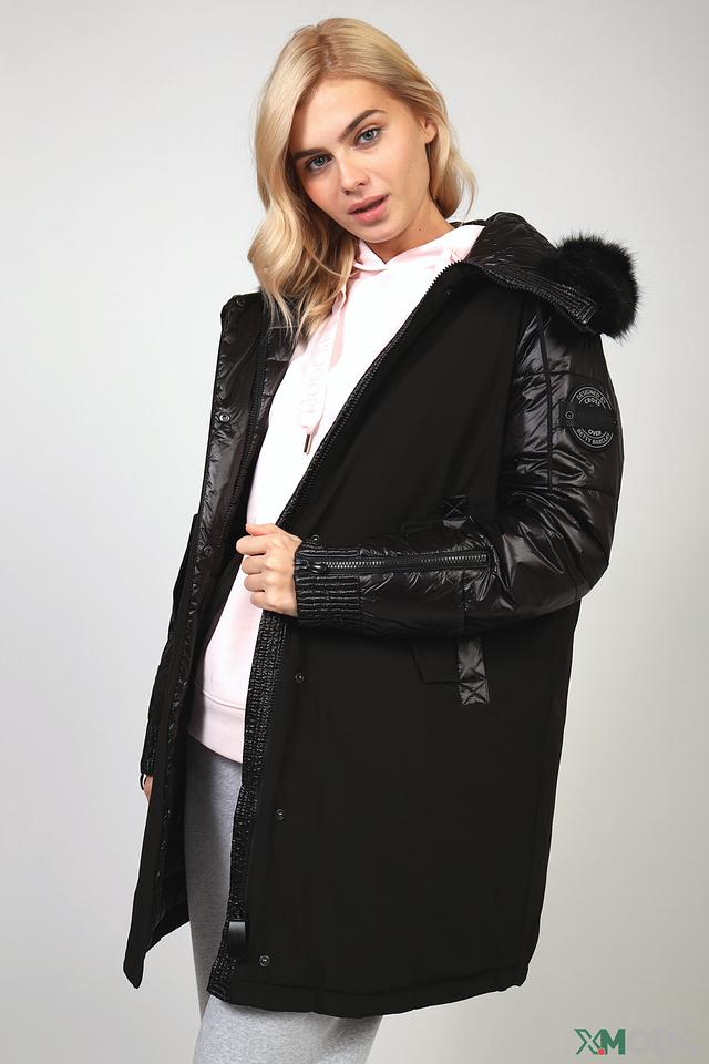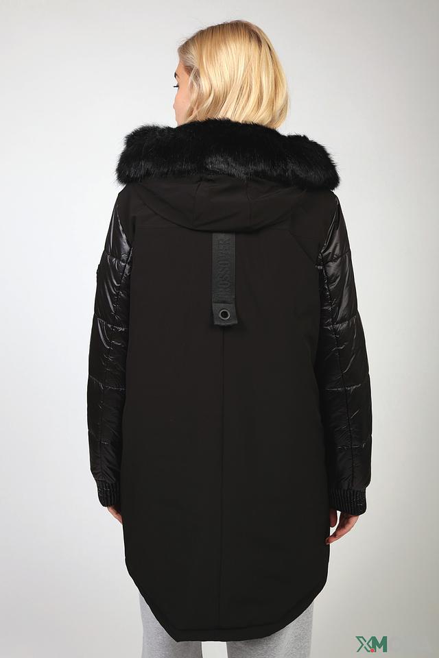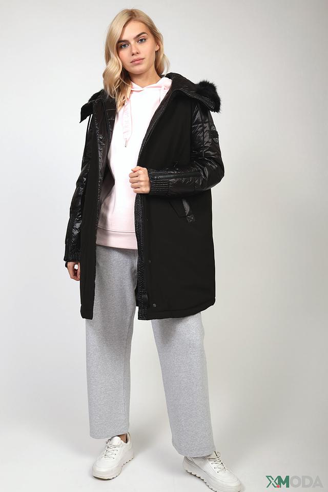 Модель имеет прямой силуэт, капюшон с отделкой искусственным мехом и стеганые вставки на рукавах и верхней части. Основная часть пальто выполнена из гладкой ткани, что придает ему элегантный вид.