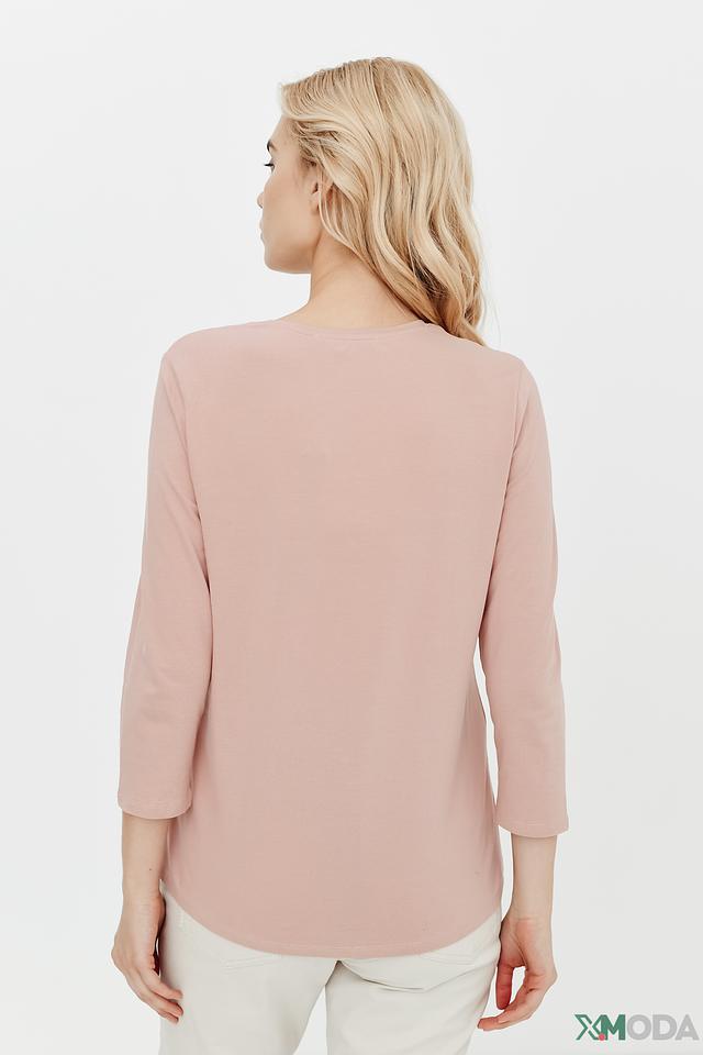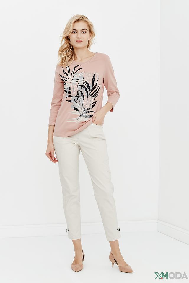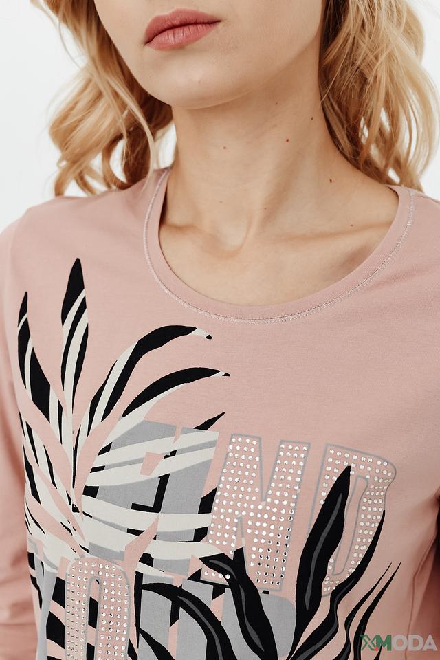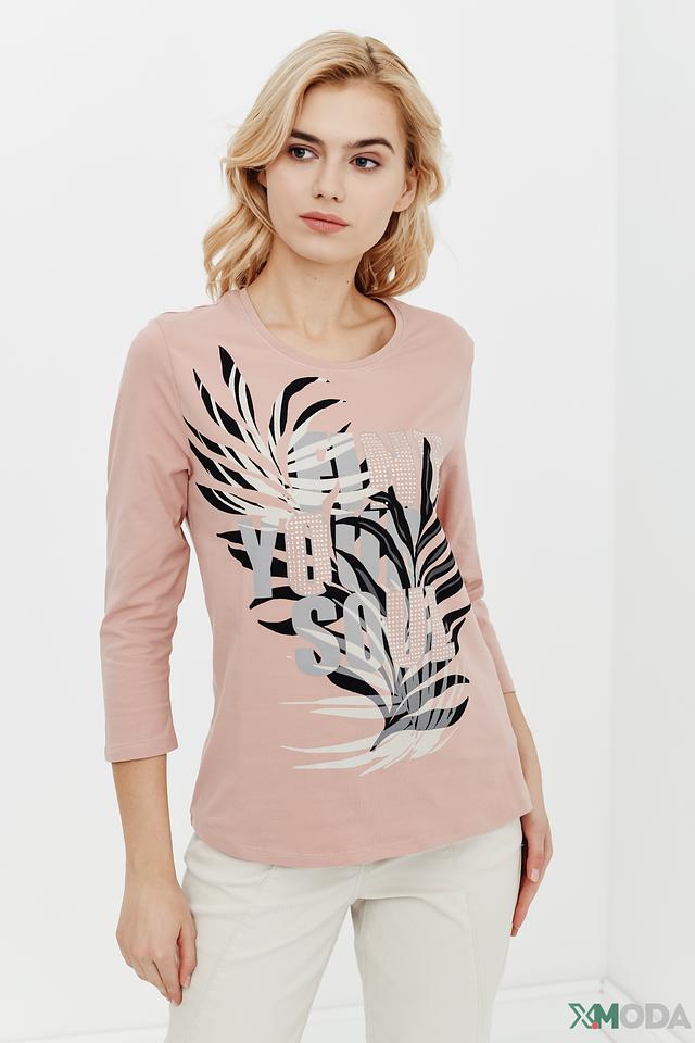 Футболка имеет нежно-розовый цвет и украшена ярким цветочным принтом, который придает ей особый шарм. Рукава 3/4 делают ее универсальной для любого времени года.