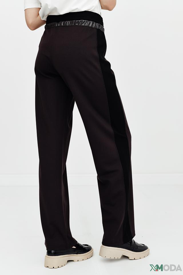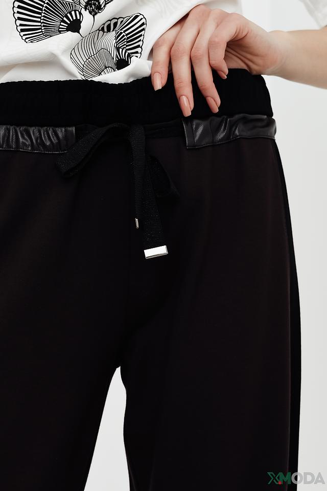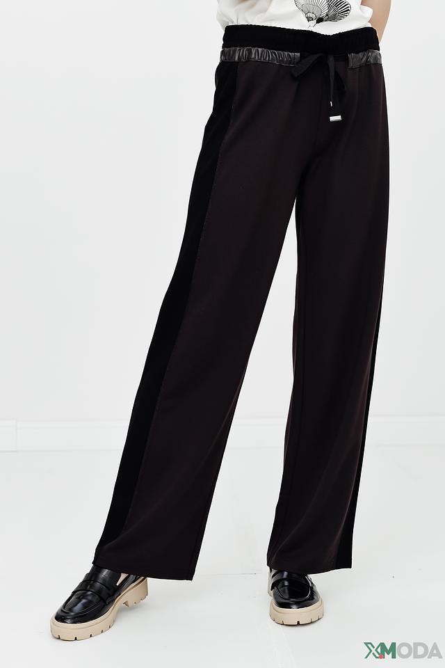 Брюки имеют прямой крой и широкие штанины, что обеспечивает свободу движений и создает современный силуэт. Пояс на резинке дополнен шнурком для регулировки посадки и декоративной металлической фурнитурой.
