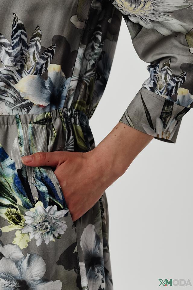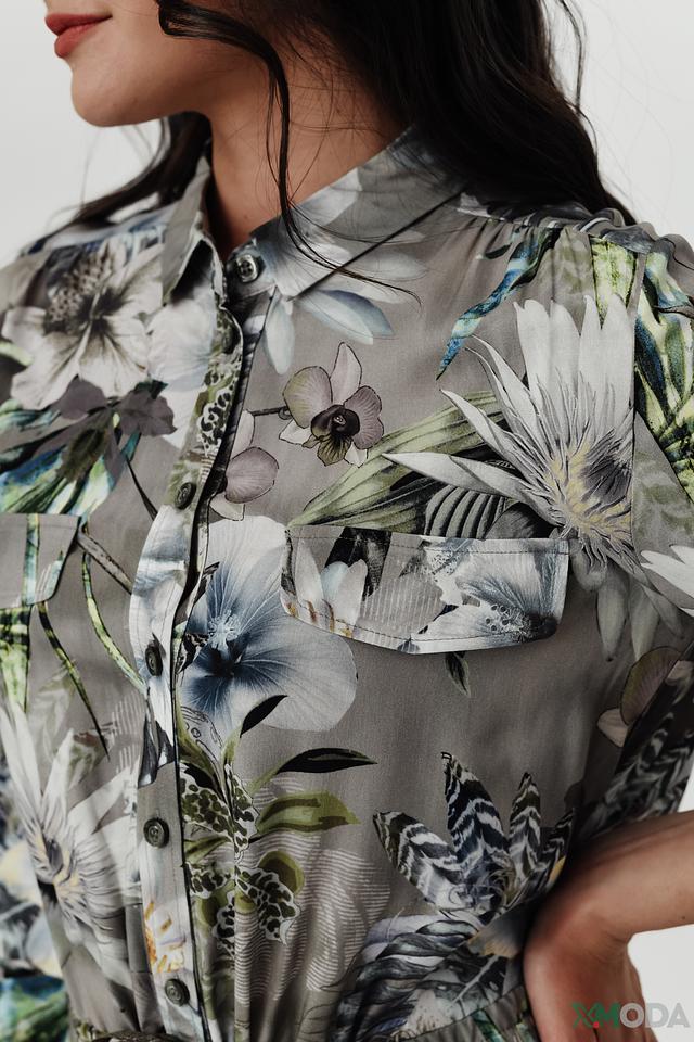 Основной цвет платья – серый, но его украшает яркий и красочный цветочный принт, включающий в себя оттенки белого, голубого, зеленого и синего. Платье имеет рубашечный крой с воротником и застежкой на пуговицы. Талию подчеркивает пояс, который можно завязать на бант или оставить распущенным.