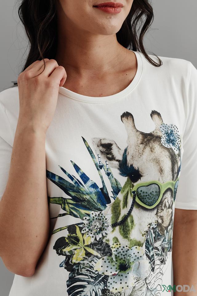 Основной цвет футболки – белый, что делает ее универсальной и легко сочетаемой с другими элементами одежды. Главная особенность модели – яркий и детализированный принт с изображением тропических листьев и экзотических птиц.
