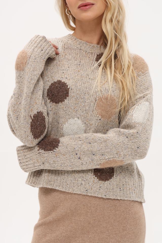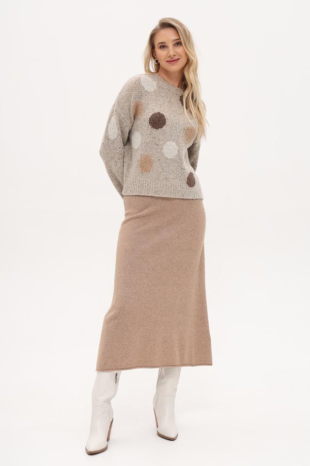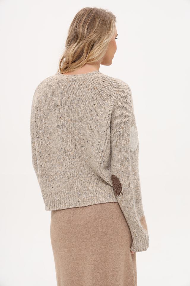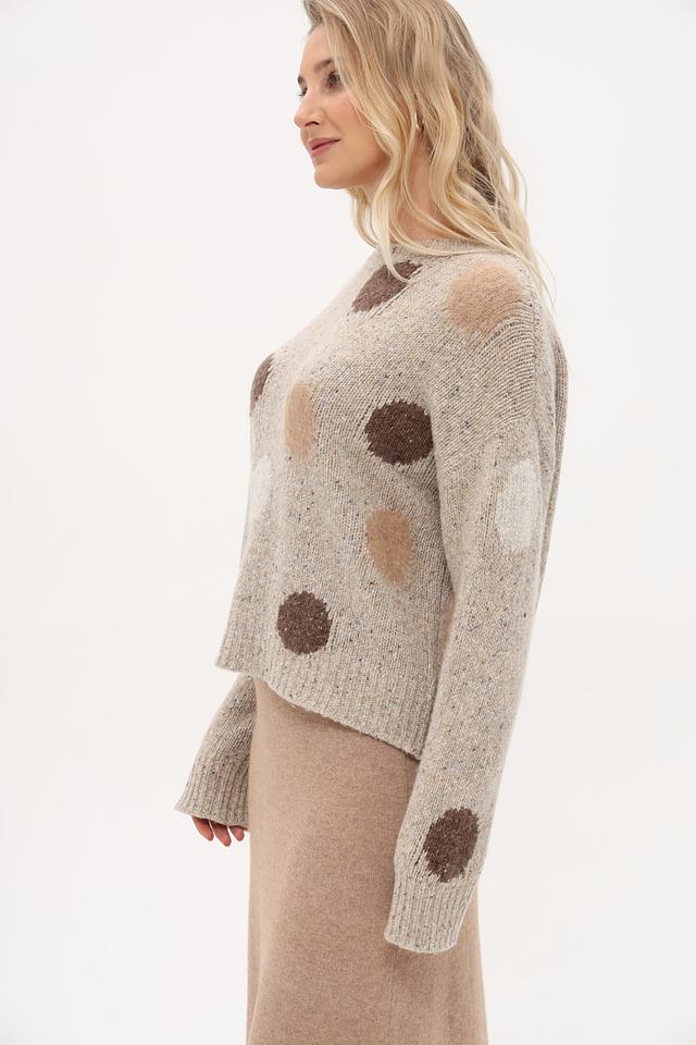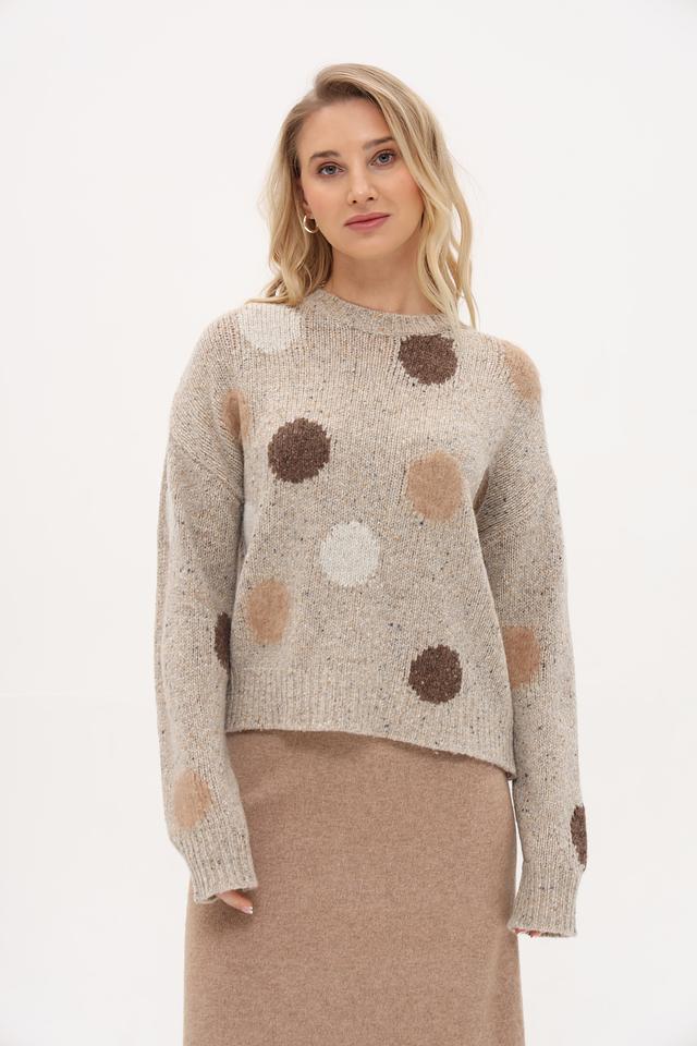 Бежевый пуловер от Oui с оригинальным дизайном в виде пятен. Изготовлен из мягкой смеси шерсти, полиамида и альпаки, обеспечивающей комфорт и тепло. Стильный и уютный выбор для повседневного гардероба. Состав: шерсть 63%, полиамид 29%, альпака 6%, эластан 1%, полиакрил 1%