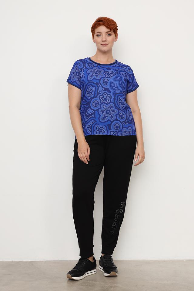Женская футболка Bianca синего цвета с ярким цветочным принтом. Изготовлена из мягкого и приятного к телу сочетания хлопка, модала и эластана, обеспечивающего комфорт при носке. Состав: хлопок 45%, модал 45%, эластан 10%