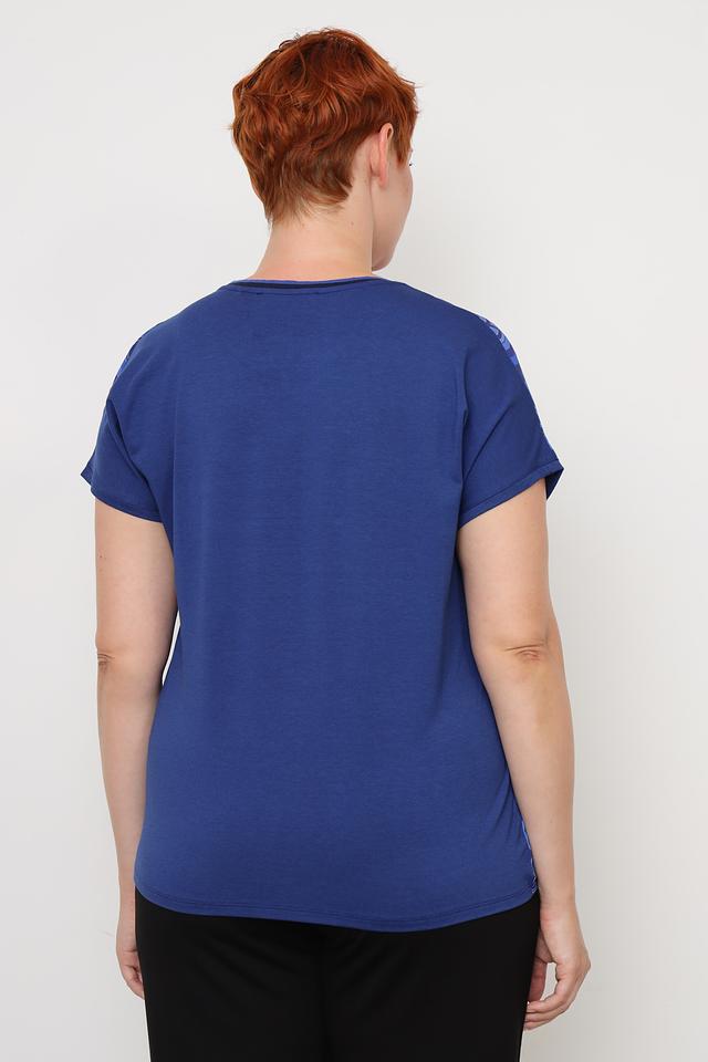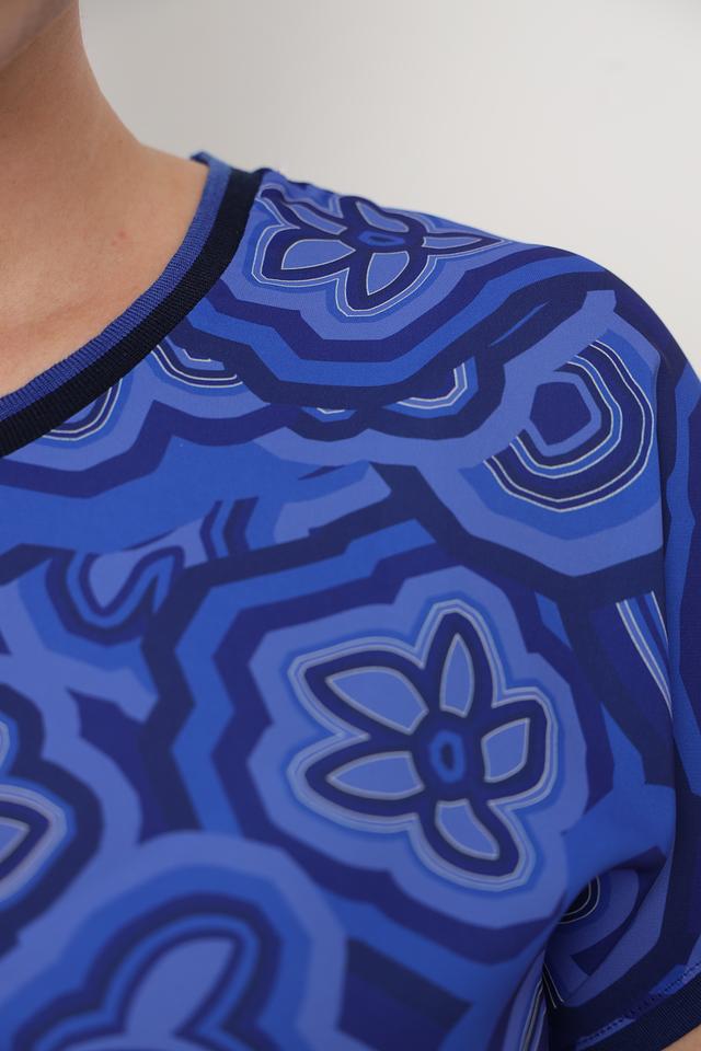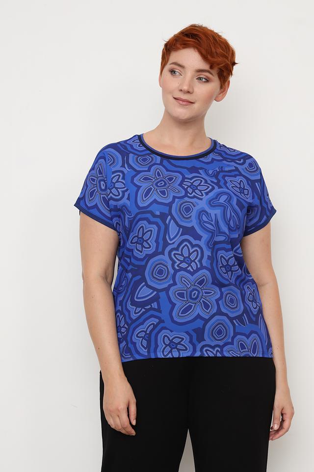 Футболка имеет прямой крой и короткие рукава. Основной цвет – насыщенный синий, который служит прекрасным фоном для яркого цветочного принта. Принт выполнен в различных оттенках синего, создавая интересный и динамичный образ.