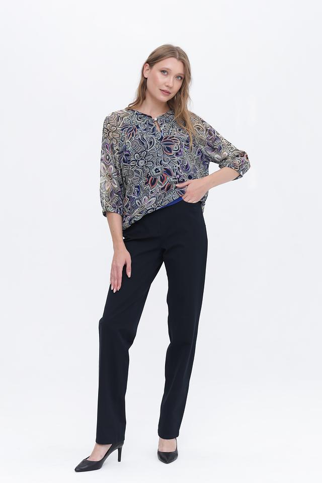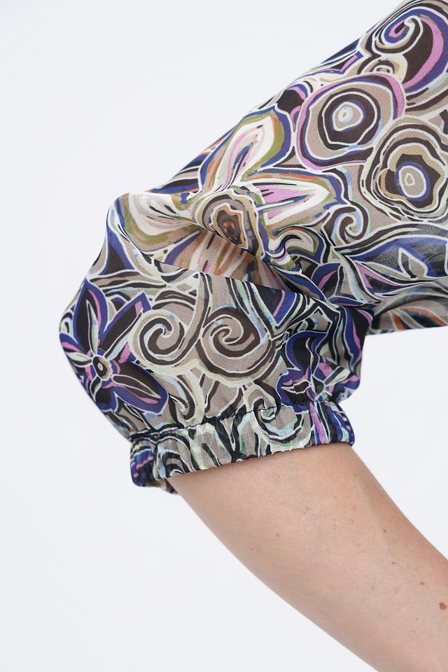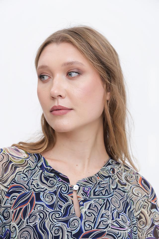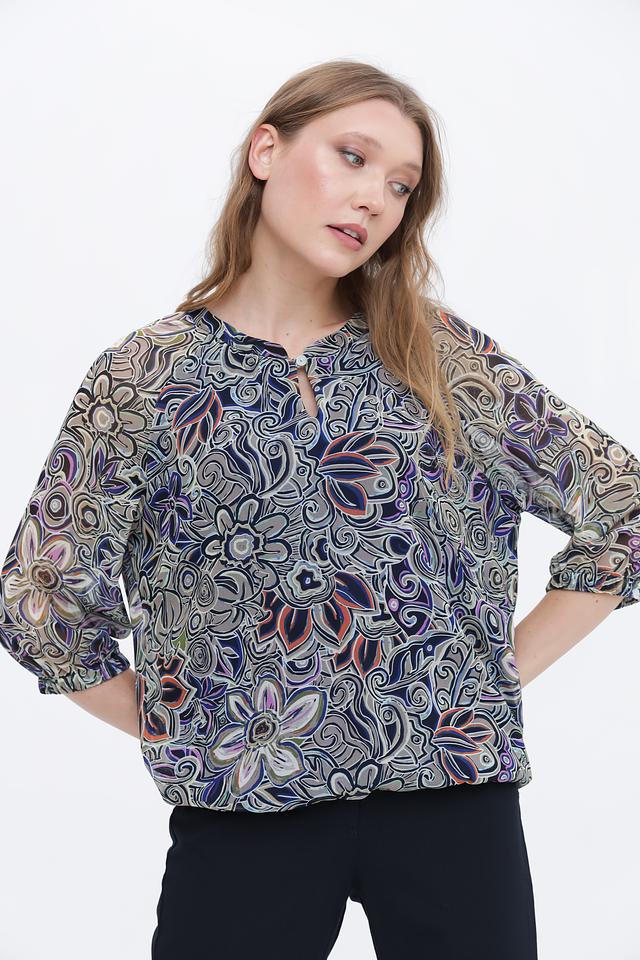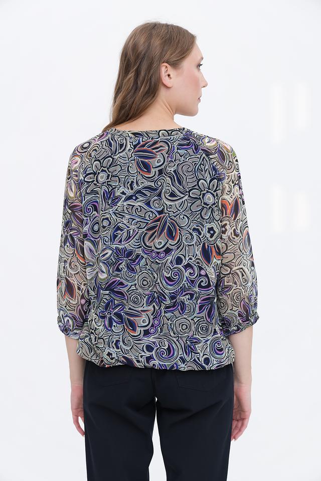 Блуза имеет оригинальный цветочный принт, сочетающий в себе различные оттенки синего, зелёного, коричневого и оранжевого. Вырез горловины оформлен небольшим V-образным разрезом с застёжкой на пуговицу. Рукава блузы длиной 3/4, слегка расклешенные к низу, что придает ей романтичный вид.