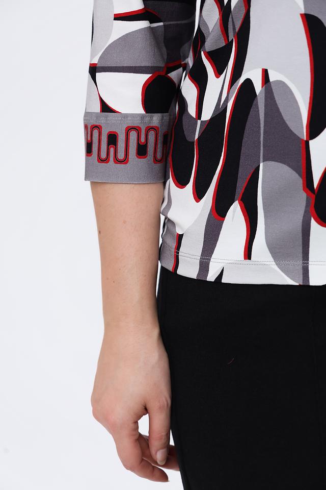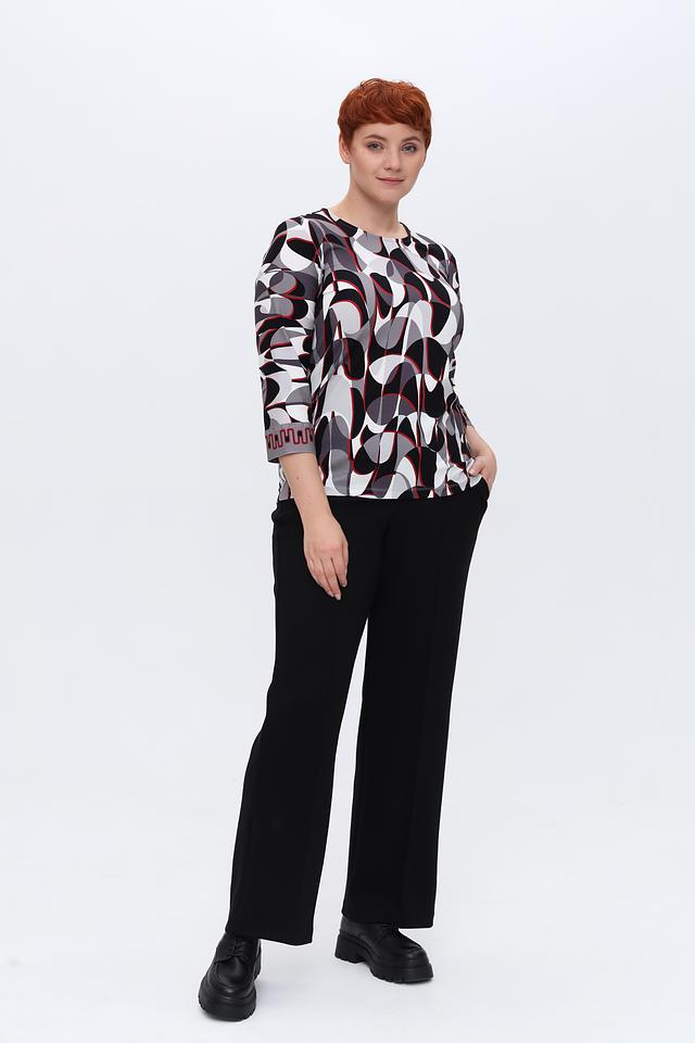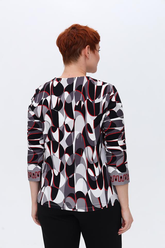 Лонгслив имеет оригинальный геометрический принт, сочетающий в себе чёрный, белый и красный цвета. Такой рисунок придаёт изделию современный и динамичный вид. Вырез горловины – округлый, классический. Рукава – три четверти.