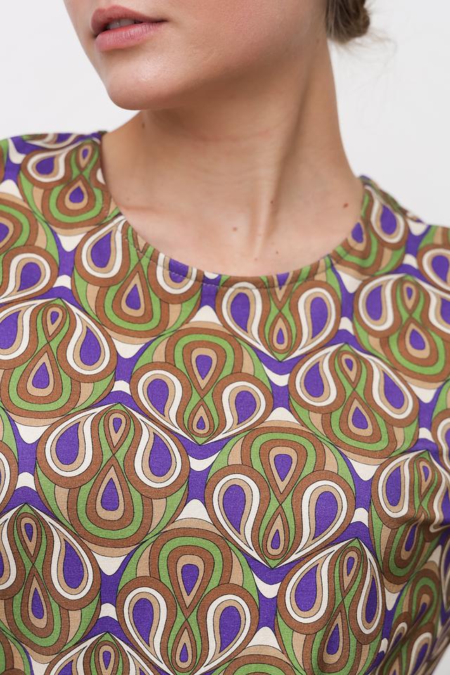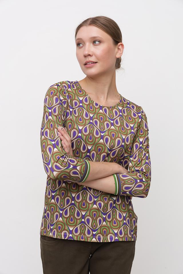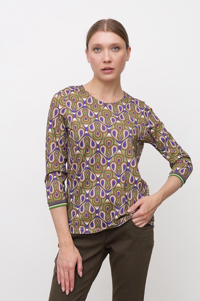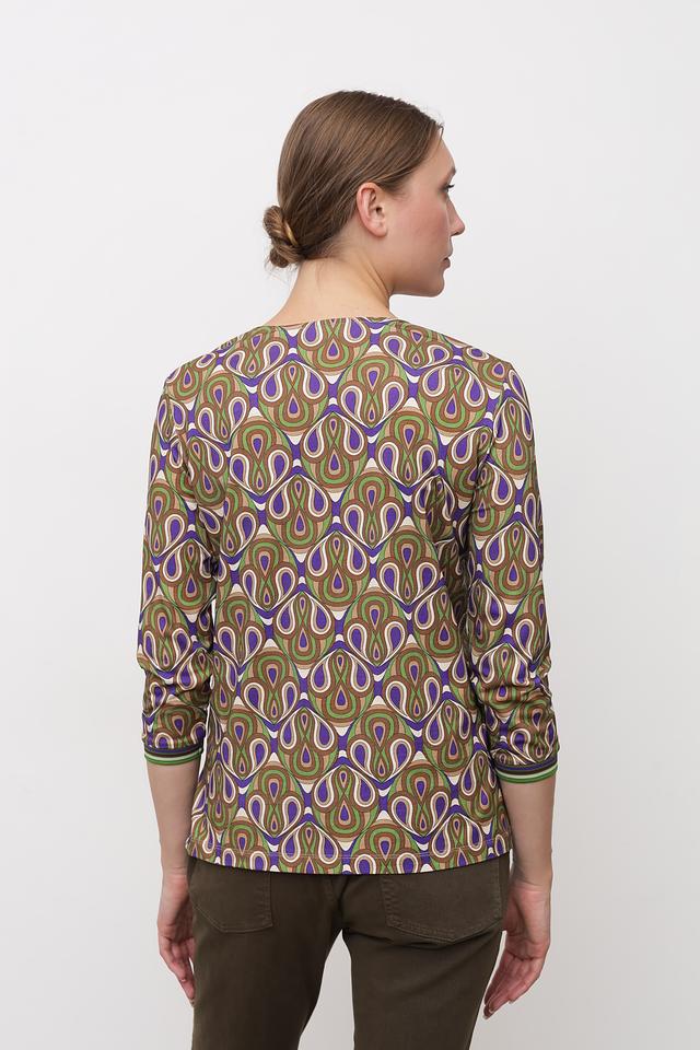 Особенностью модели является яркий и запоминающийся принт в геометрическом стиле, выполненный в сочетании зеленых, синих и коричневых оттенков. Лонгслив имеет круглый вырез горловины и длинные рукава.
