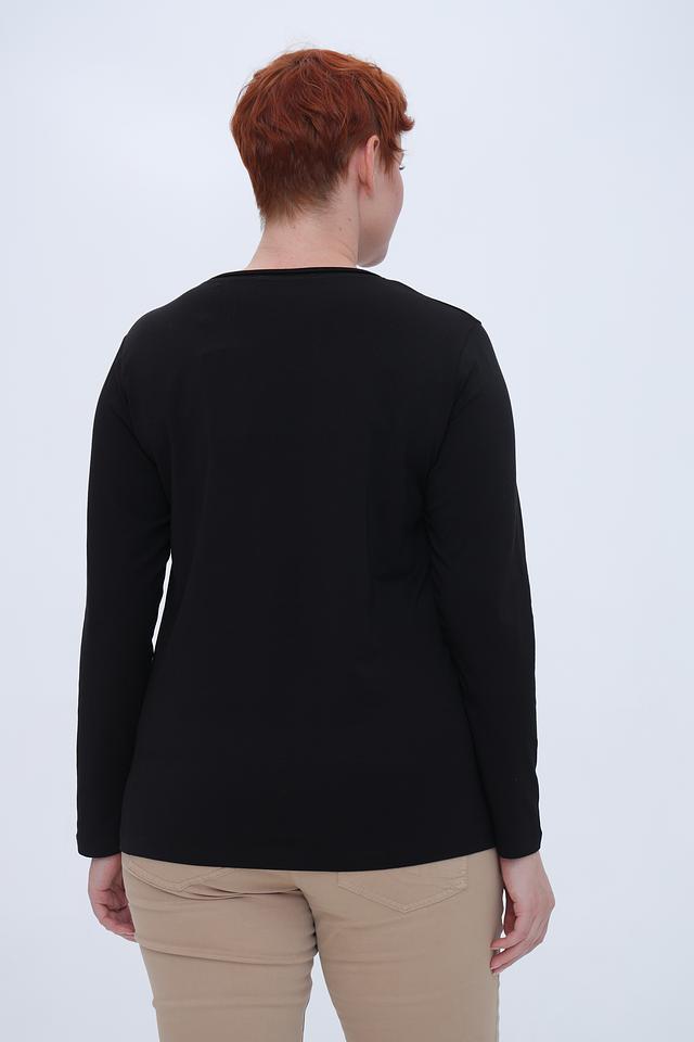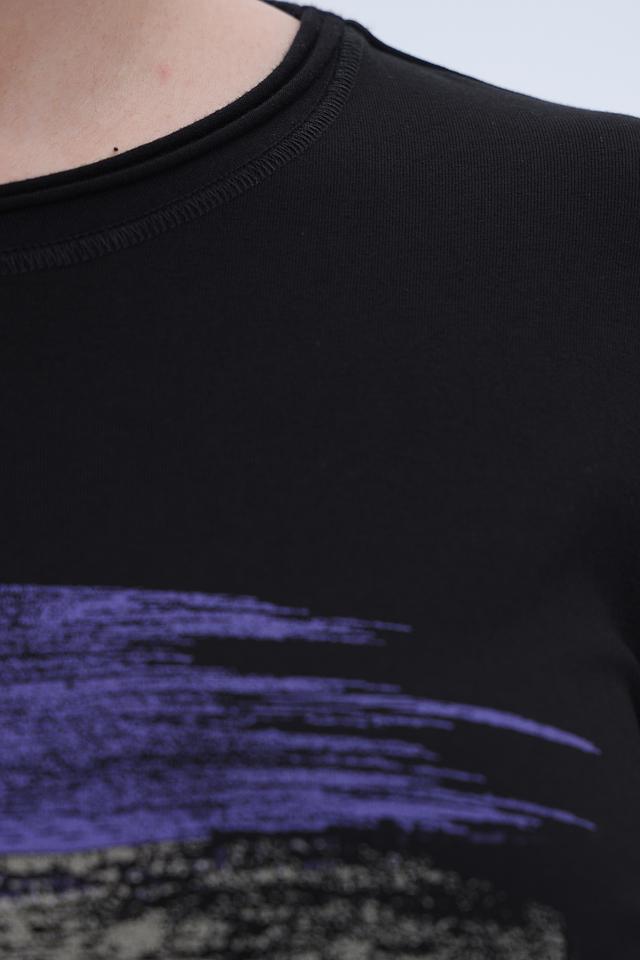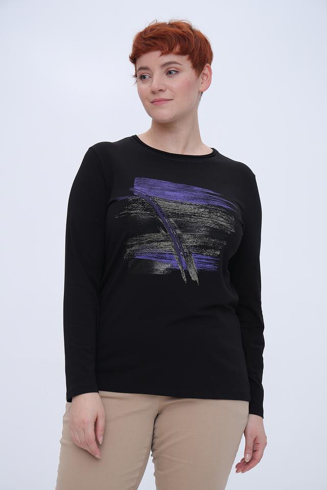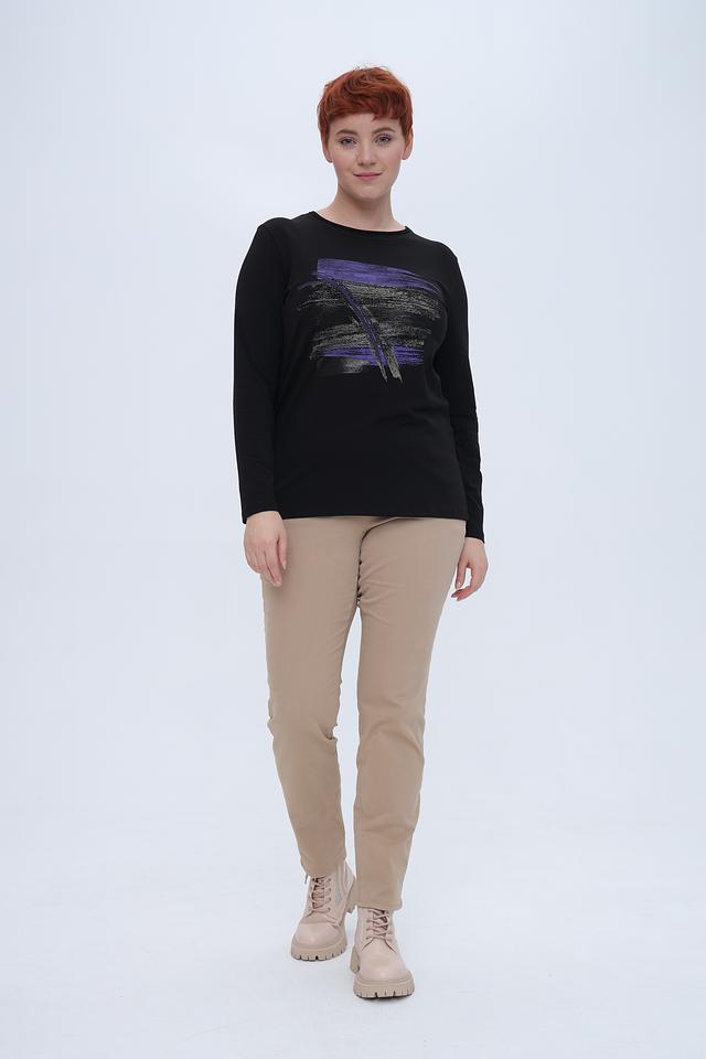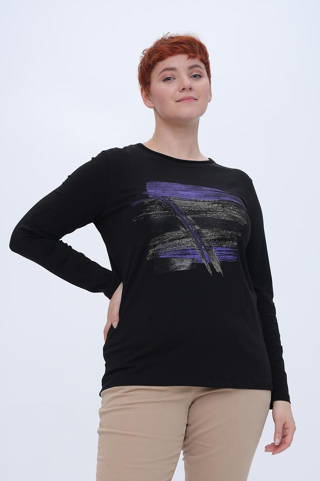 Чёрный лонгслив от Bianca с оригинальным принтом в фиолетовых и золотистых тонах. Изготовлен из мягкого и приятного к телу сочетания хлопка, модала и эластана, обеспечивающего комфорт при носке. Состав: хлопок 45%, модал 45%, эластан 10%