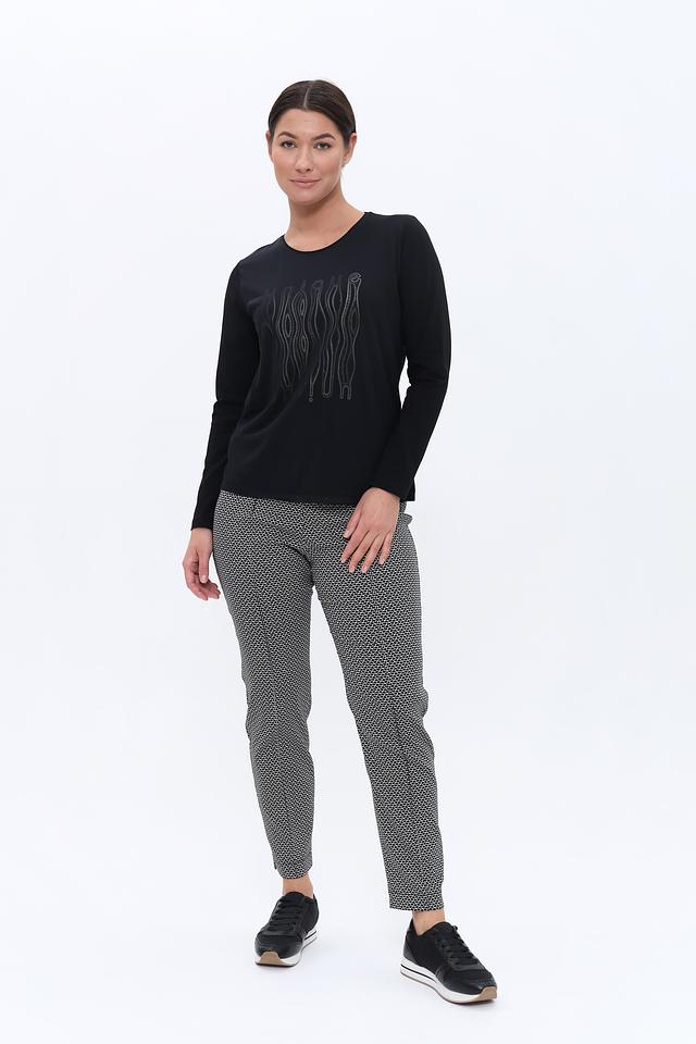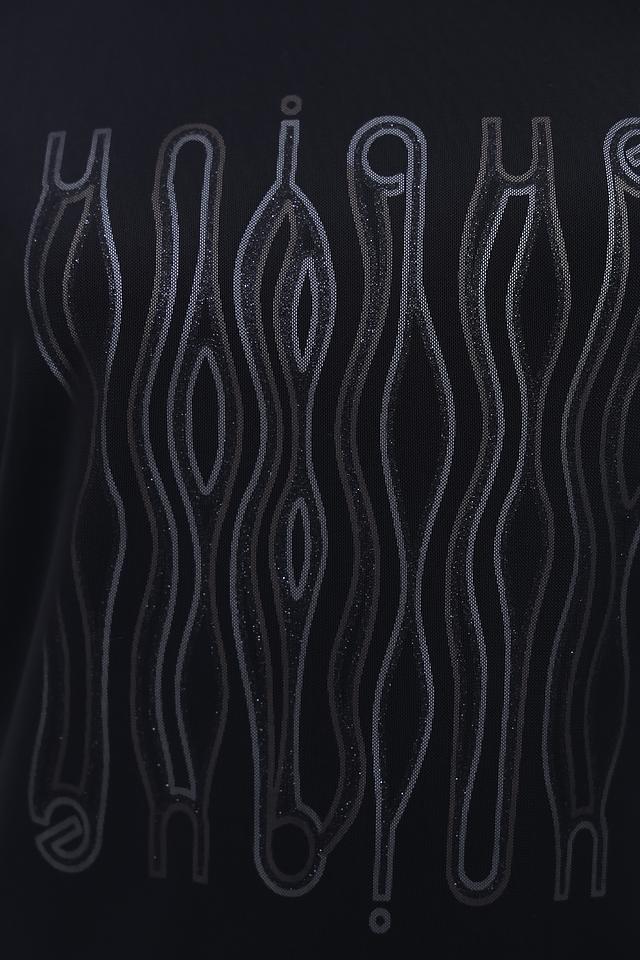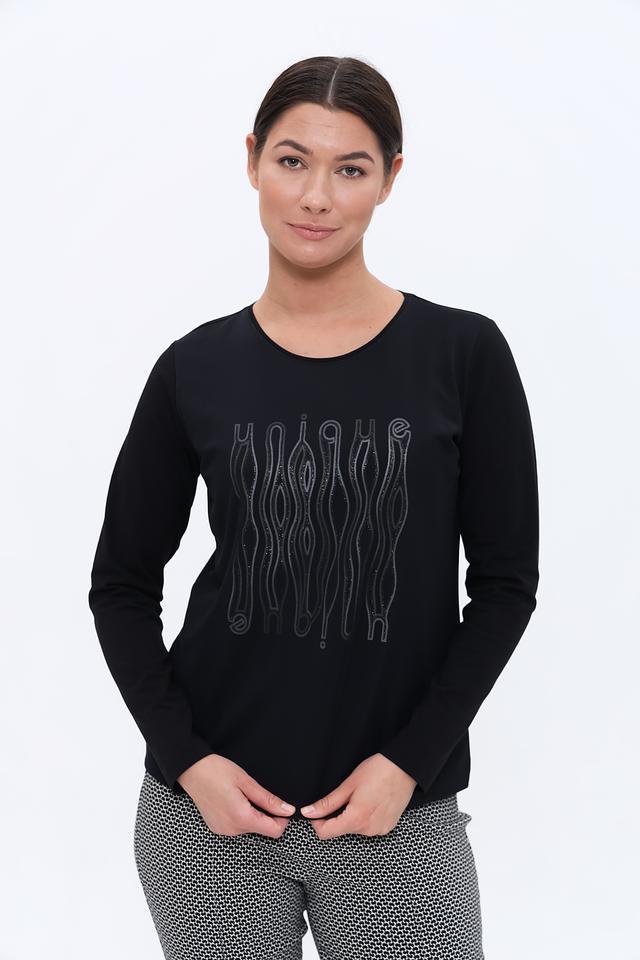 Чёрный лонгслив от Bianca с оригинальным графичным принтом. Изготовлен из мягкого хлопка с добавлением эластана для комфортной посадки и свободы движений. Идеально подходит для создания повседневных образов. Состав: хлопок 92%, эластан 8%