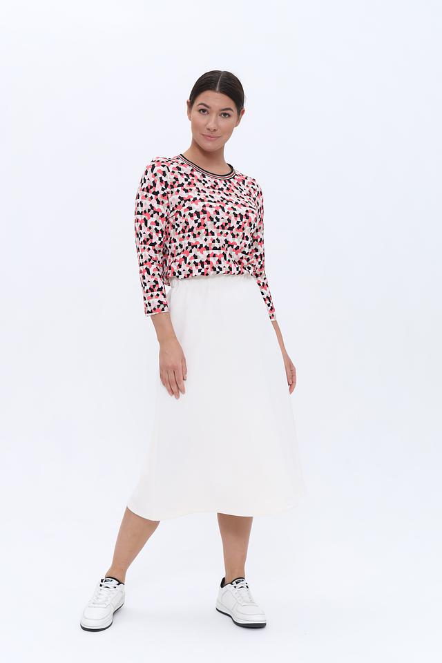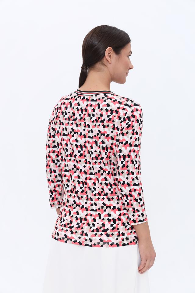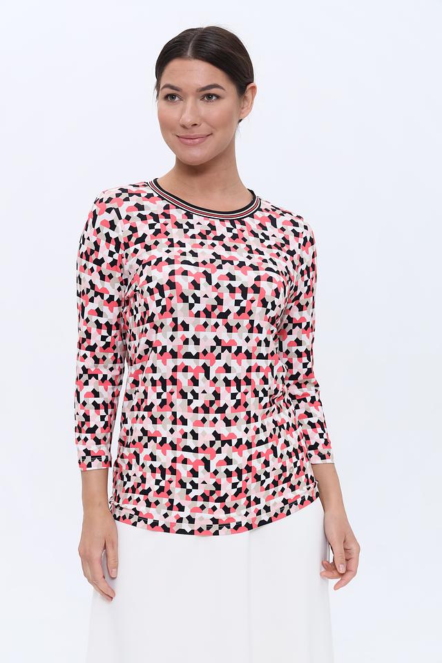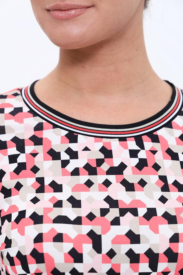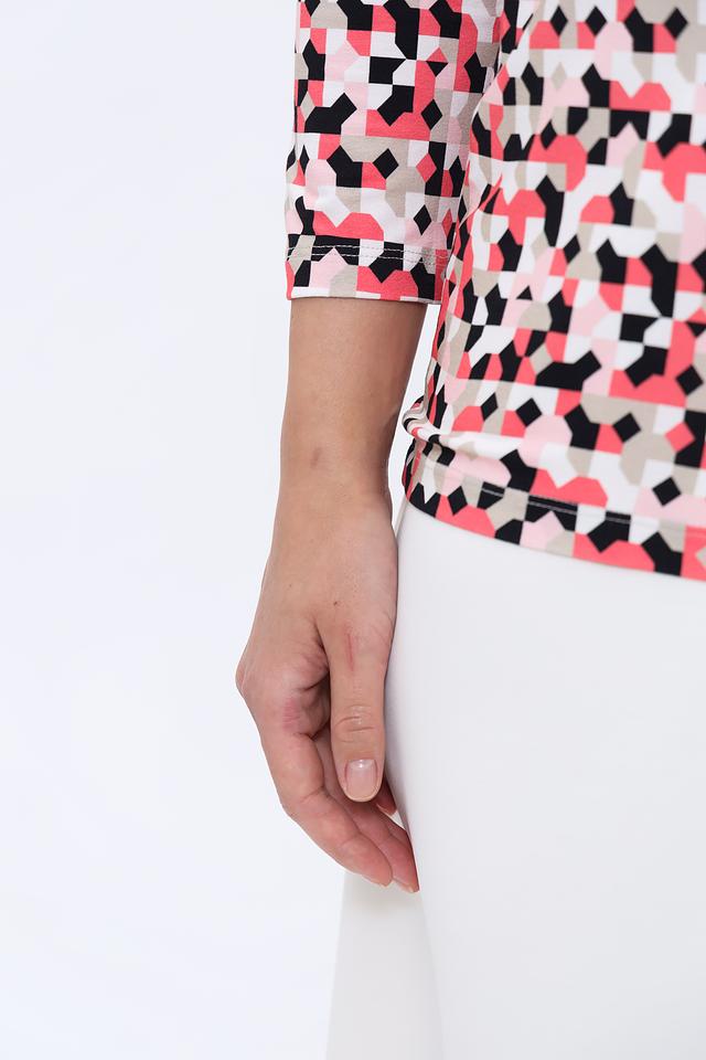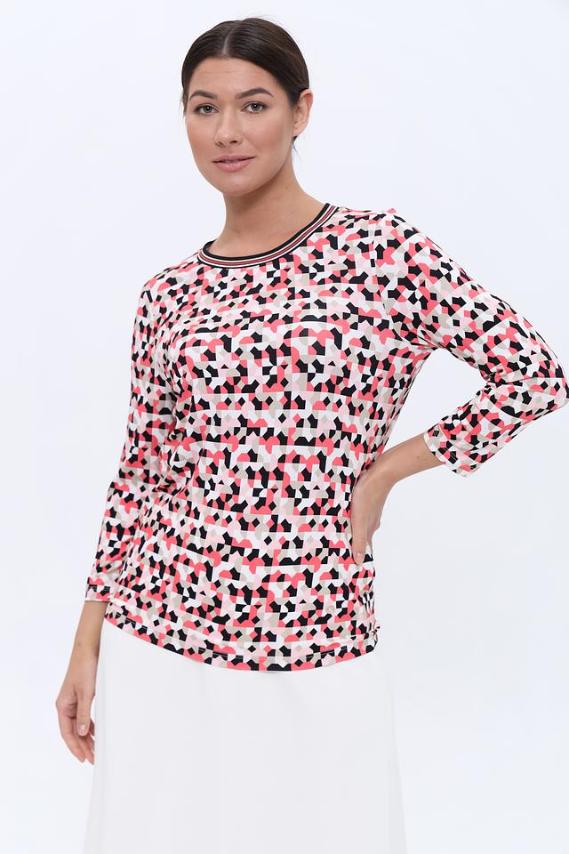 Лонгслив имеет оригинальный геометрический принт, сочетающий в себе оттенки розового, красного, чёрного и белого. Круглый вырез горловины и длинные рукава делают его универсальным для различных образов.