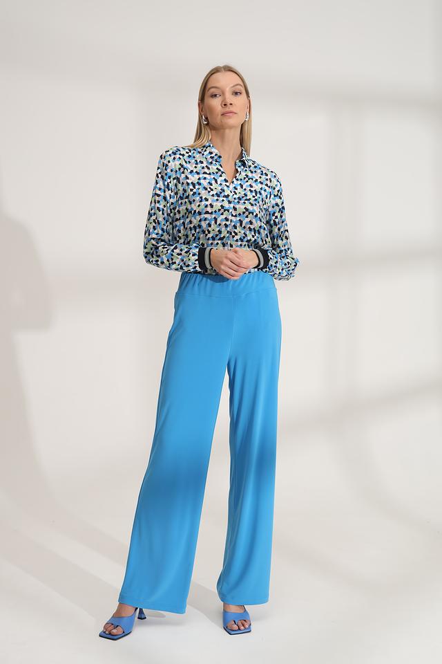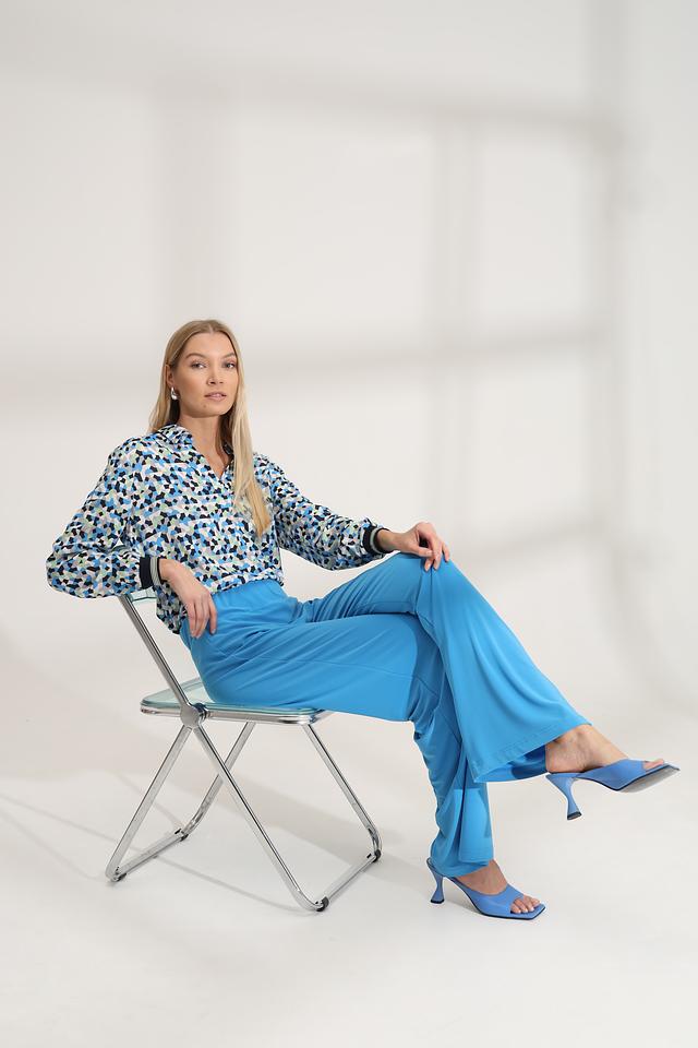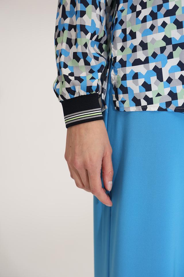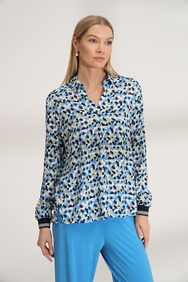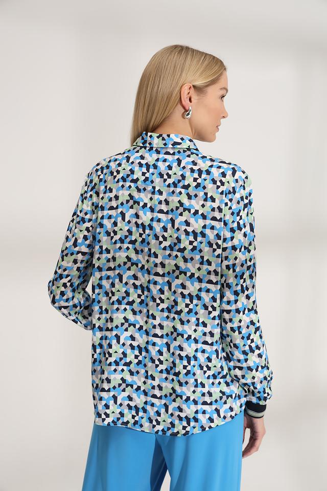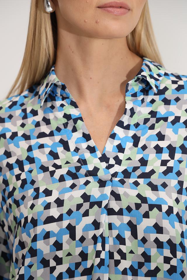Эта блуза от Bianca – идеальный выбор для создания яркого и запоминающегося образа. Выполнена в голубой цветовой гамме с оригинальным геометрическим принтом, который состоит из треугольников и других фигур в различных оттенках синего, зелёного и белого.