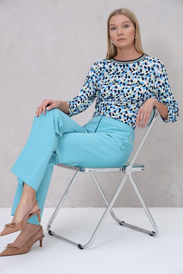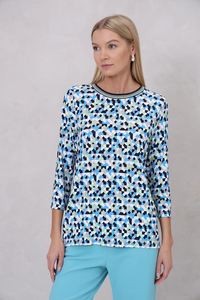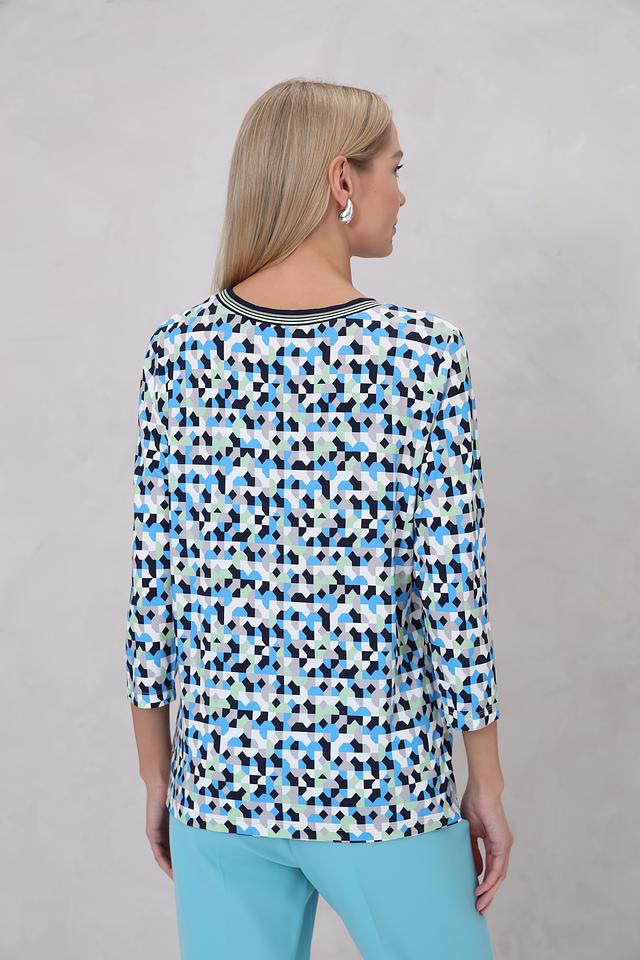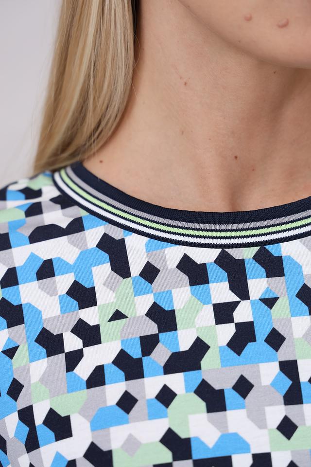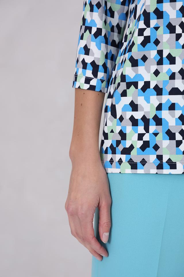 Лонгслив имеет округлый вырез горловины и длинные рукава. Главная особенность модели – яркий геометрический принт, выполненный в сочетании синих, зеленых и черных оттенков. Такой рисунок добавит образу оригинальности и динамики.