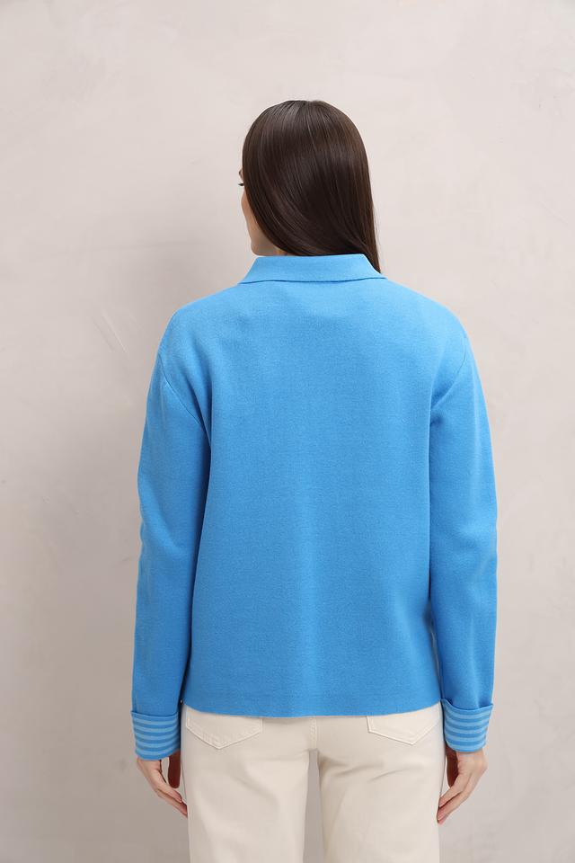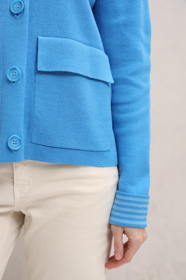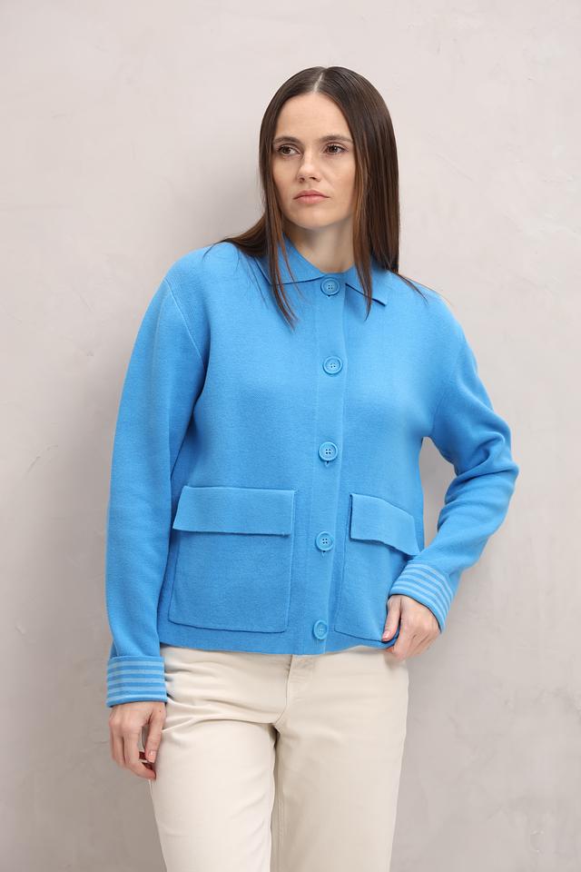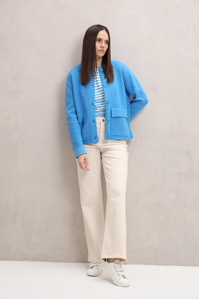 Голубой жакет Bianca из трикотажа с карманами и застежкой на пуговицы. Модель имеет воротник и манжеты в полоску, что добавляет образу оригинальности. Жакет станет отличным дополнением к вашему гардеробу. Состав: полиакрил 51%, хлопок 42%, полиамид 7%