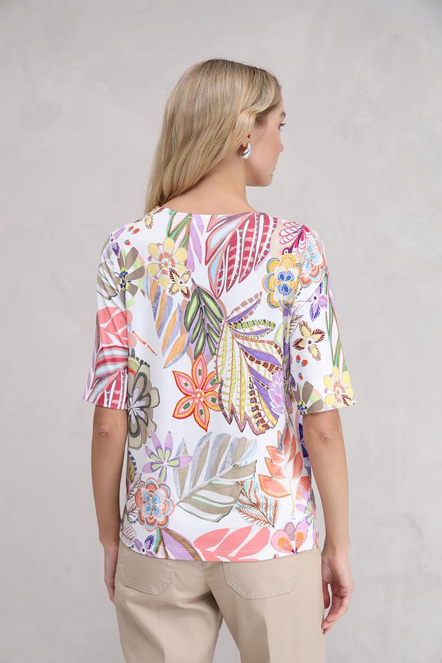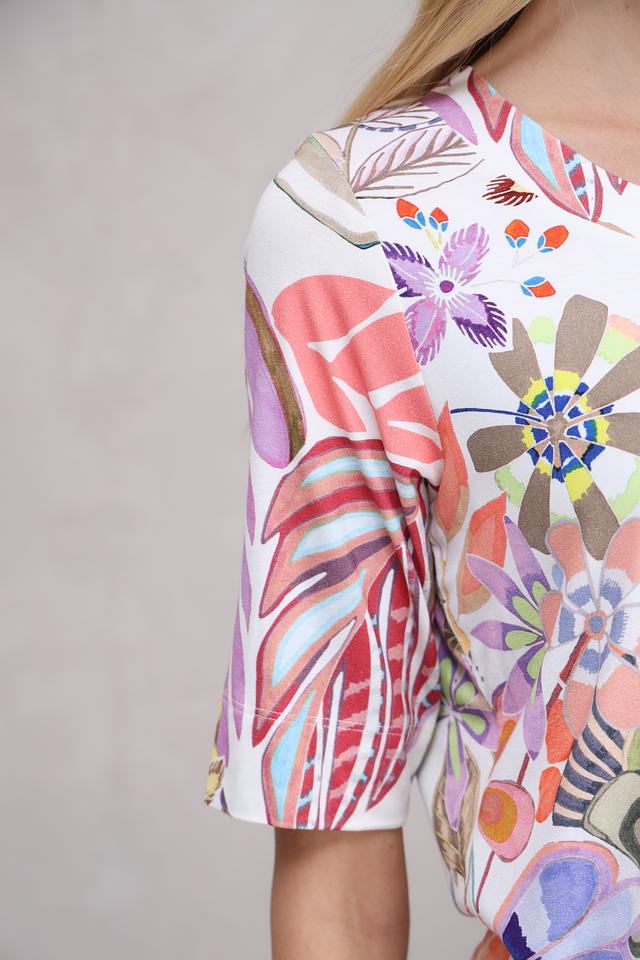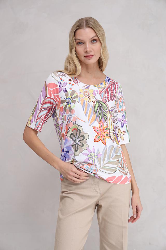 Футболка имеет прямой крой и короткий рукав, что делает ее универсальной для различных типов фигур. Основной цвет – белый, а главным украшением является красочный цветочный принт, который добавляет легкости и женственности.