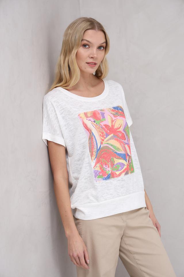 Эта футболка от Bianca станет ярким акцентом в вашем гардеробе. Она выполнена в белом цвете и украшена красочным цветочным принтом, который придает ей оригинальность и свежесть.