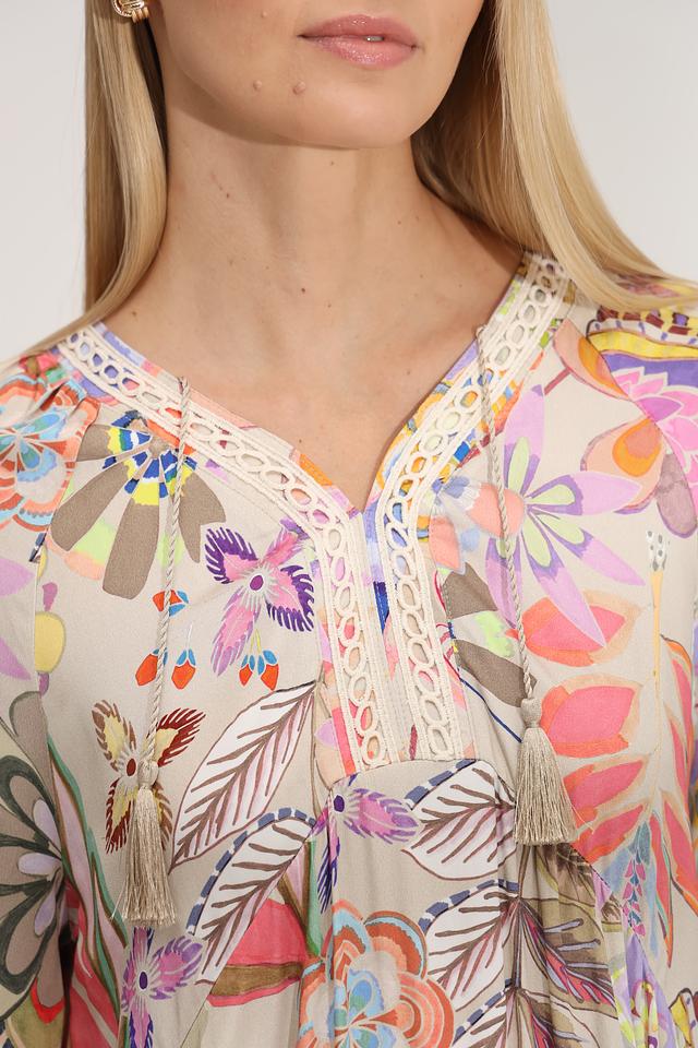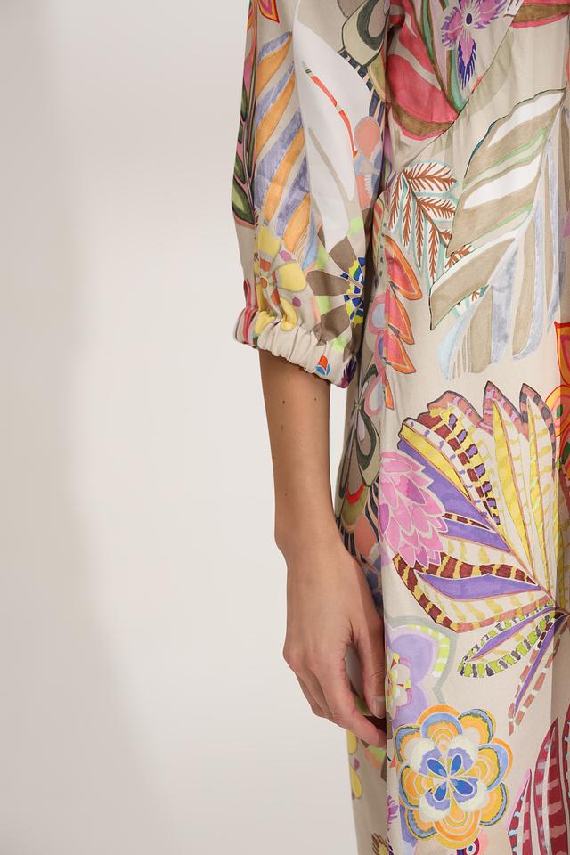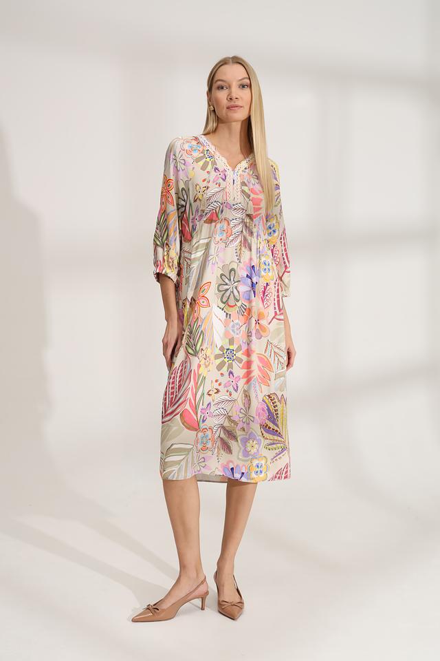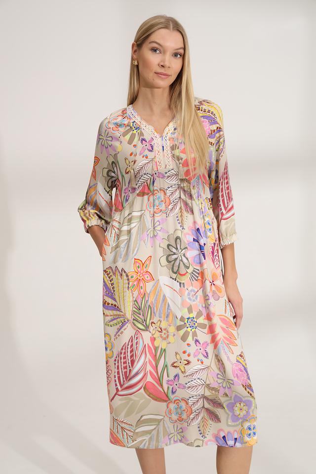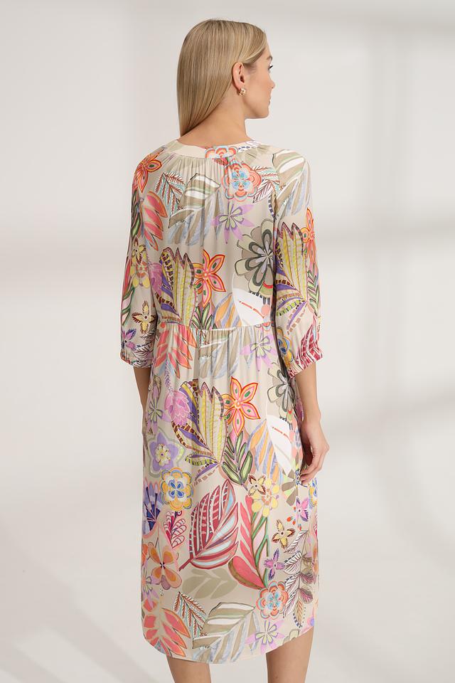 Платье имеет яркий цветочный принт, который придает ему неповторимый и жизнерадостный вид. V-образный вырез подчеркивает линию шеи, а рукава 3/4 со сборкой добавляют образу романтичности.