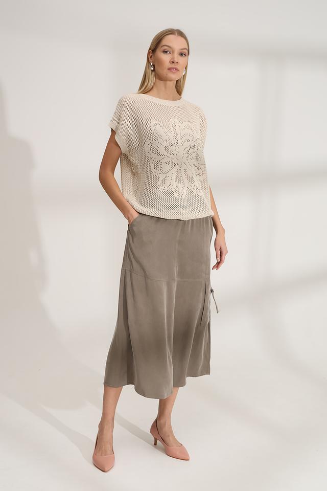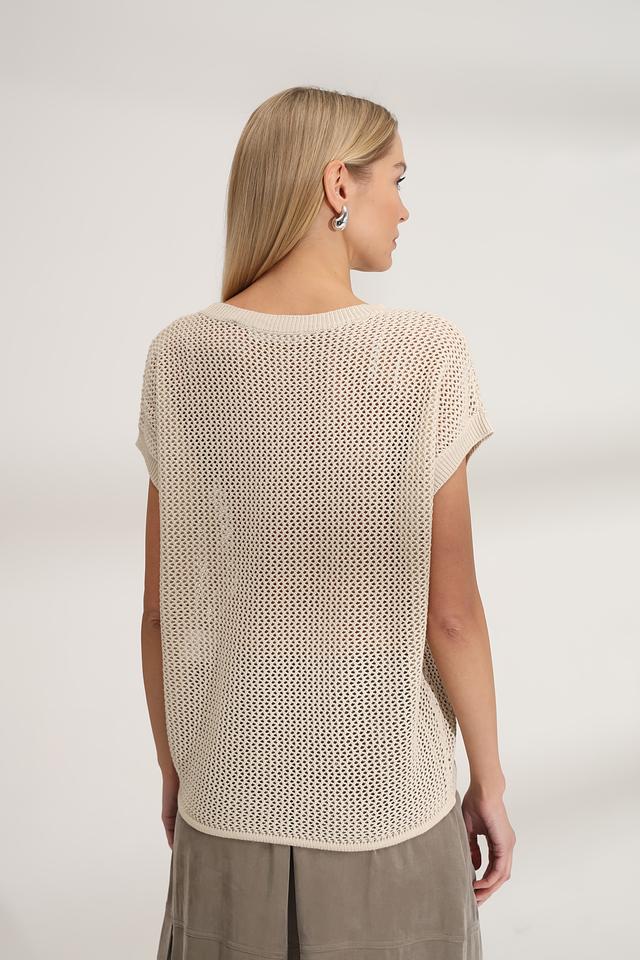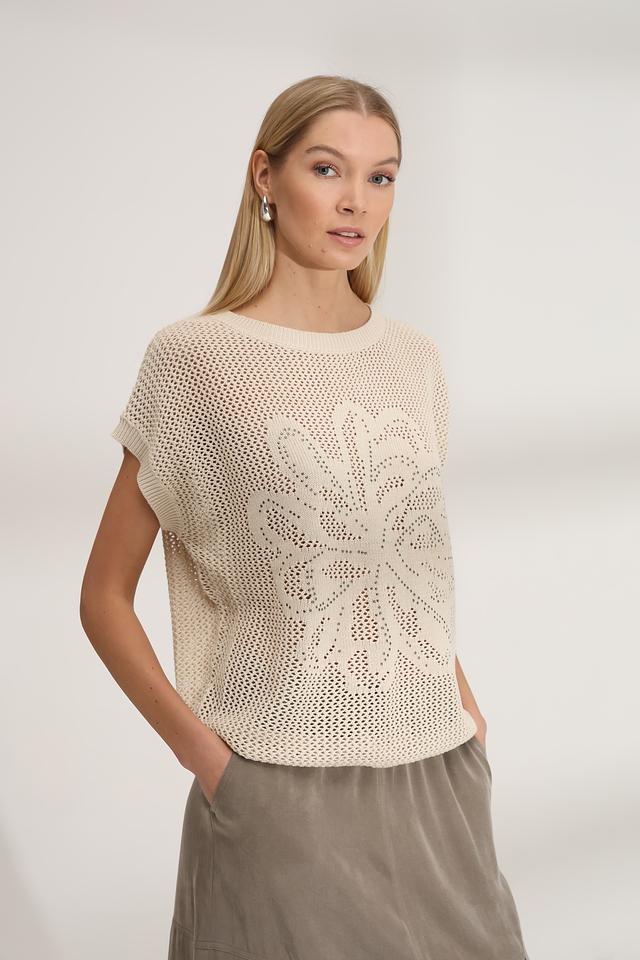 Бежевый пуловер от Bianca с ажурной кружевной вставкой на груди. Модель выполнена из мягкого трикотажа с короткими рукавами, идеально подходит для создания лёгкого и стильного образа. Состав: полиакрил 55%, хлопок 45%