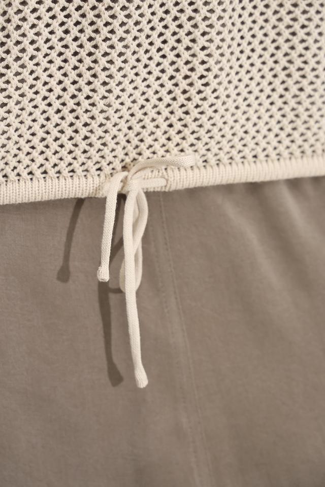 Пуловер имеет свободный крой и короткие рукава, что делает его идеальным выбором для тёплой погоды. Особый акцент в дизайне – кружевная вставка на груди, которая придает изделию изысканность и женственность.