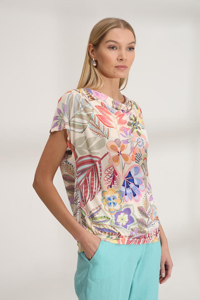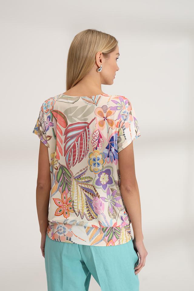 Блуза Bianca с ярким цветочным принтом станет стильным дополнением к вашему гардеробу. Модель выполнена из лёгкой ткани с добавлением эластана, что обеспечивает комфорт и свободу движений. Идеально подходит для создания ярких летних образов. Состав: полиэстер 95%, эластан 5%