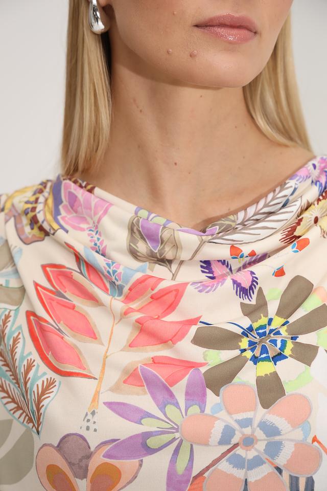 Основной акцент блузы – это её яркий и красочный цветочный принт, который состоит из множества оттенков: розового, фиолетового, оранжевого, зелёного и других. Принт покрывает всю поверхность блузы, создавая эффектный и запоминающийся образ.