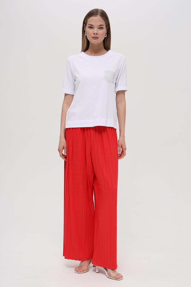 Особенностью данной модели является декоративный элемент в виде кармана, выполненного из мерцающих страз. Этот акцент придает футболке изысканность и оригинальность.