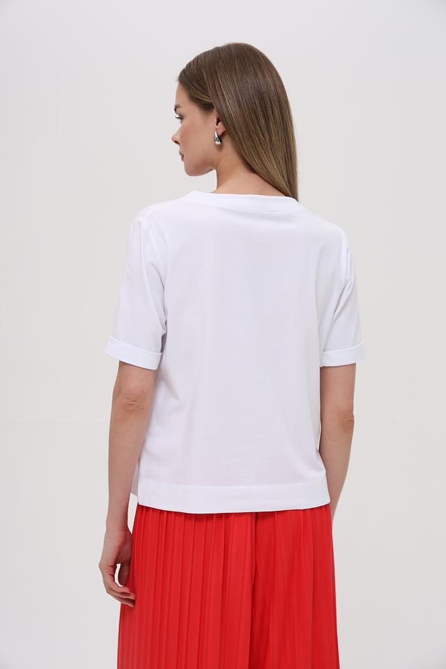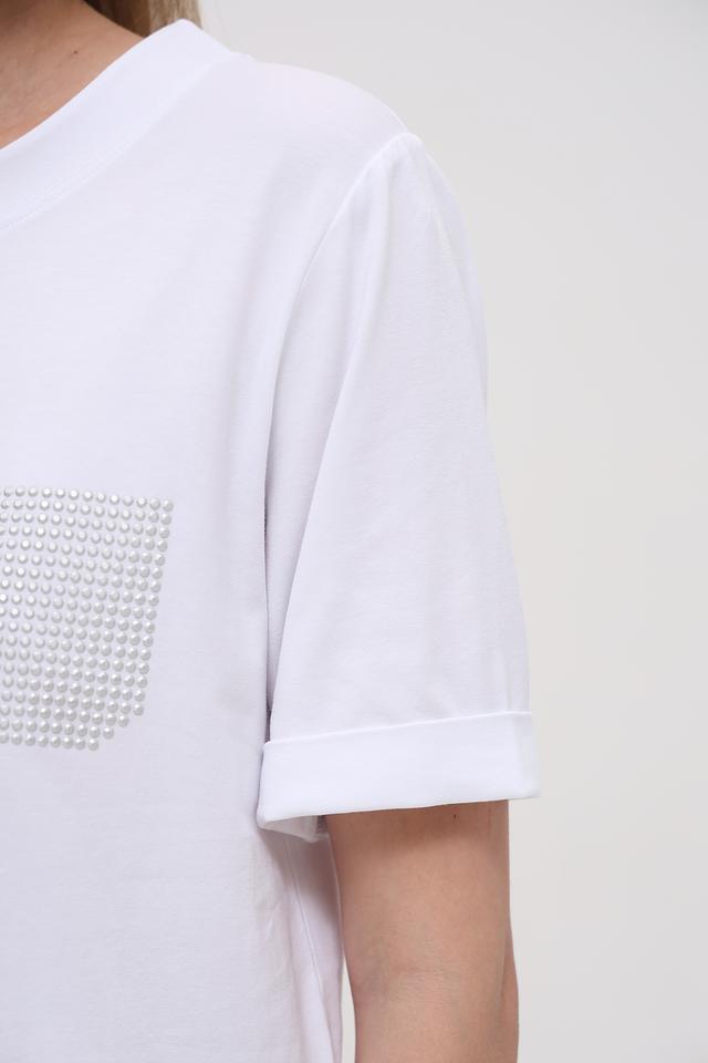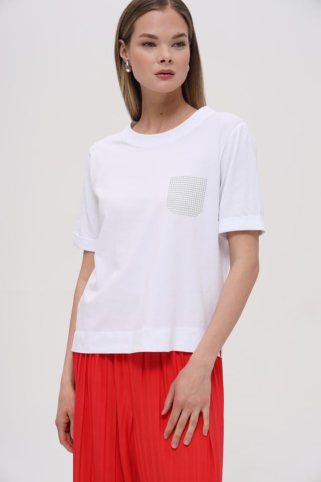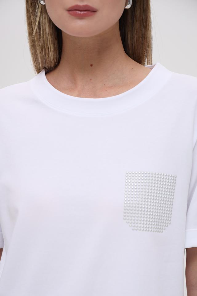 Белая футболка Bianca из хлопка с коротким рукавом, украшенная декоративной аппликацией в виде кармана, инкрустированного стразами. Стильная и комфортная модель для повседневного образа. Состав: хлопок 92%, эластан 8%