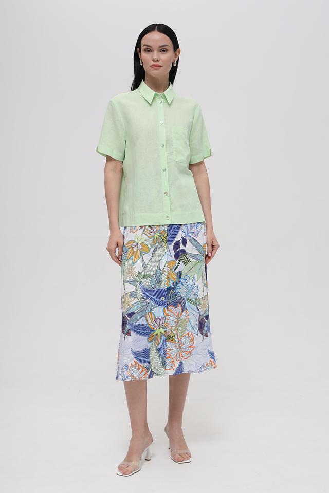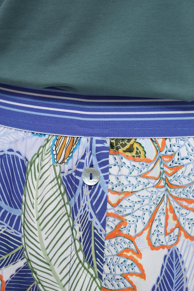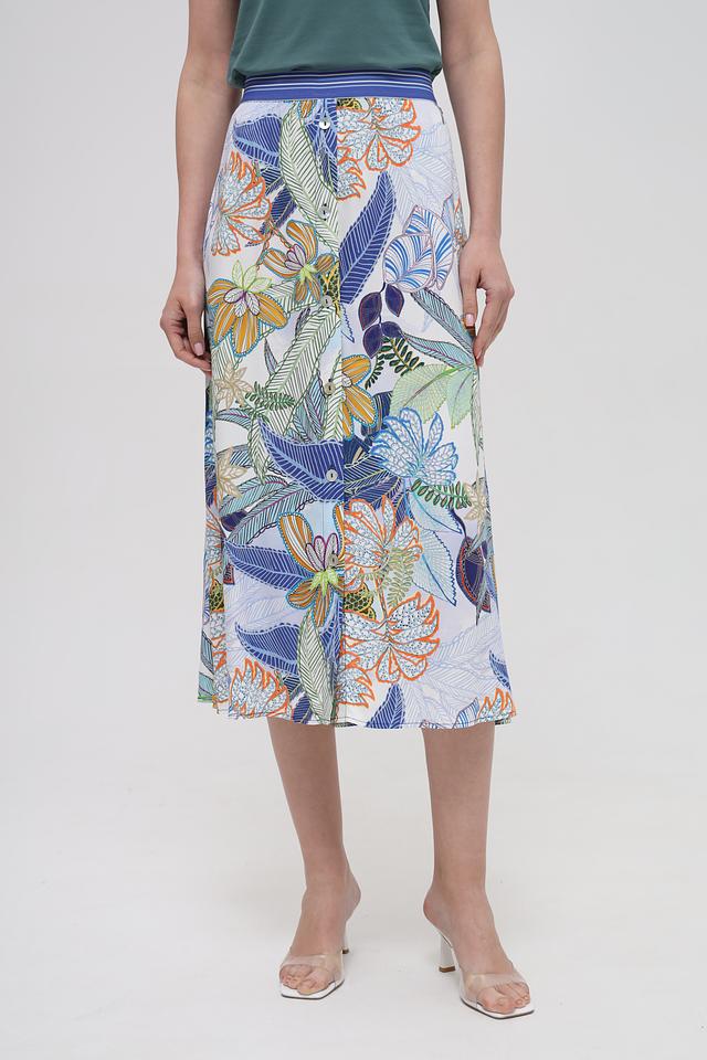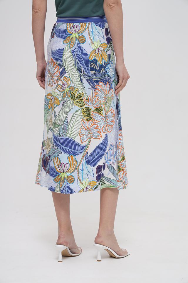 Юбка имеет длину миди и прямой крой, который подчеркивает фигуру. Главная особенность – это эффектный принт с изображением тропических листьев и цветов в ярких оттенках. Эластичный пояс обеспечивает удобную посадку по талии.