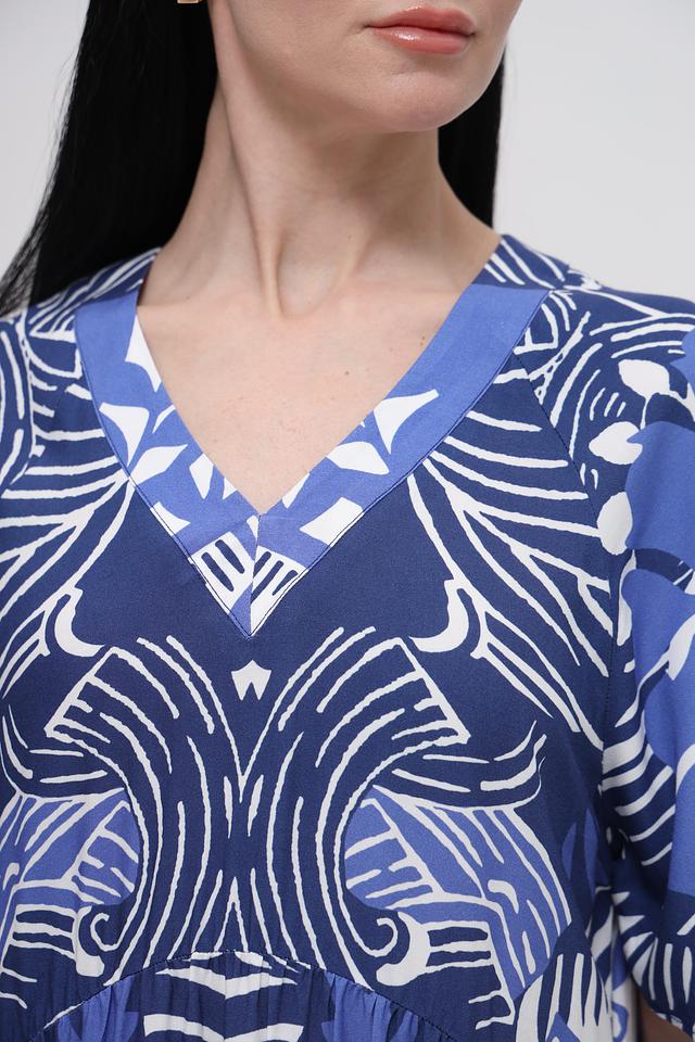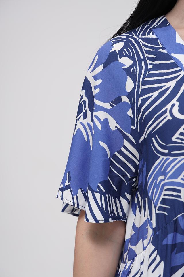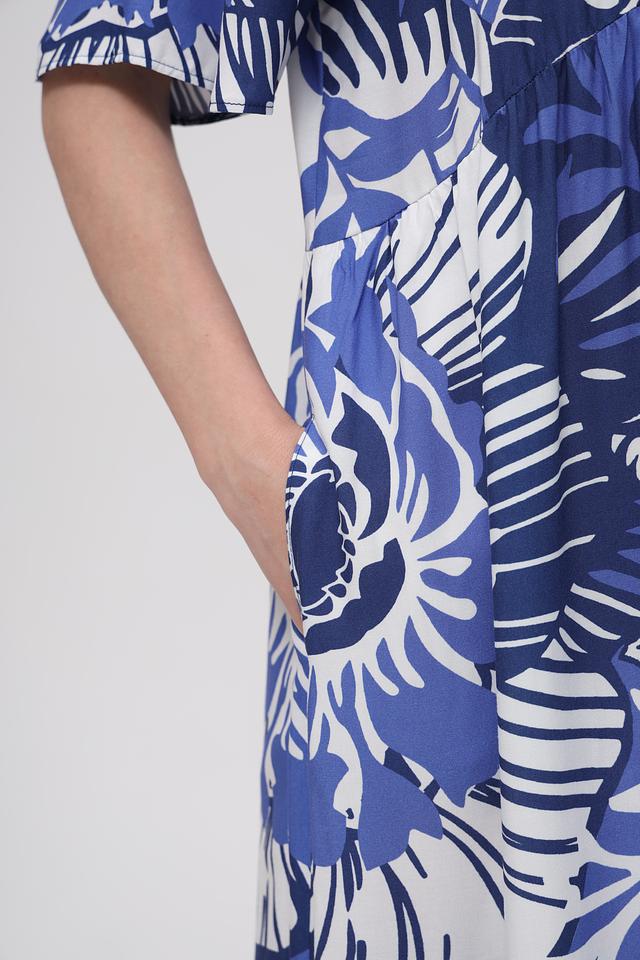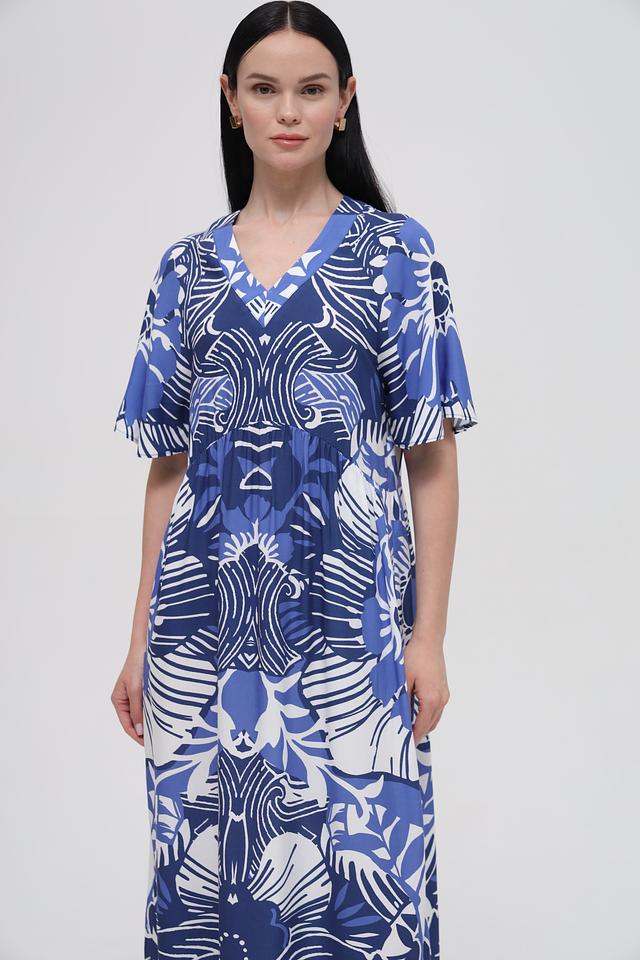 Платье имеет прямой силуэт и длину миди, что делает его универсальным для различных случаев. V-образный вырез горловины и короткие рукава с воланами придают образу женственность и лёгкость. Основной цвет платья – синий, но оно украшено ярким и красочным цветочным принтом, который делает его неповторимым.