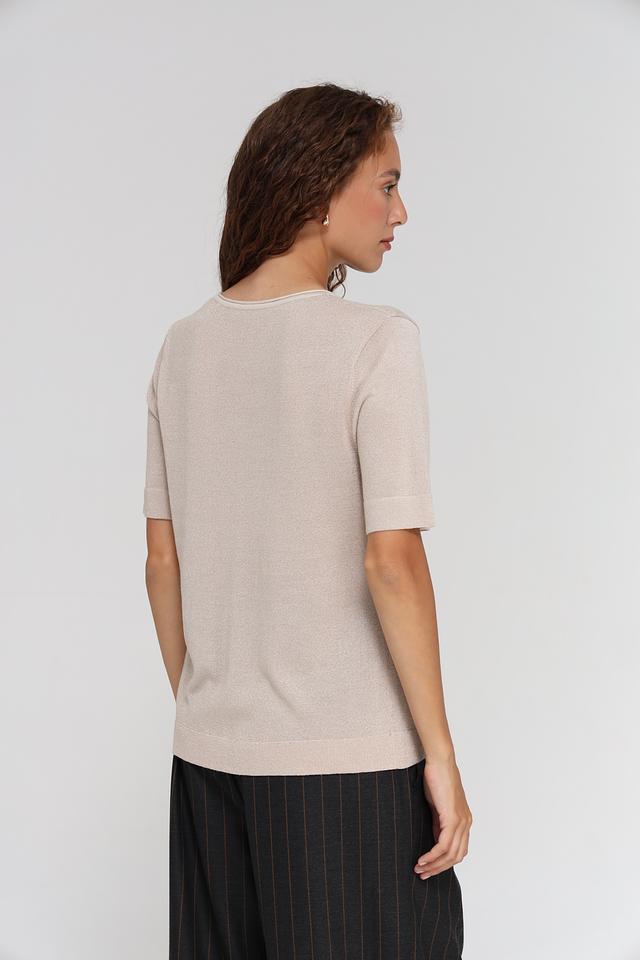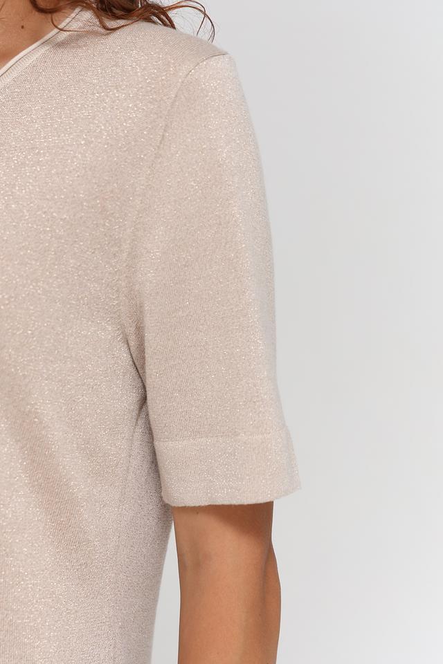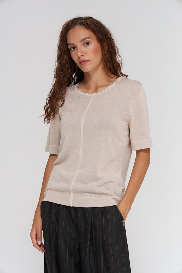 Бежевый пуловер от Bianca с коротким рукавом и деликатной металлизированной нитью. Модель имеет круглый вырез горловины и вертикальную вставку спереди, придающую ей оригинальность. Состав: вискоза 80%, метализ.нить 20%