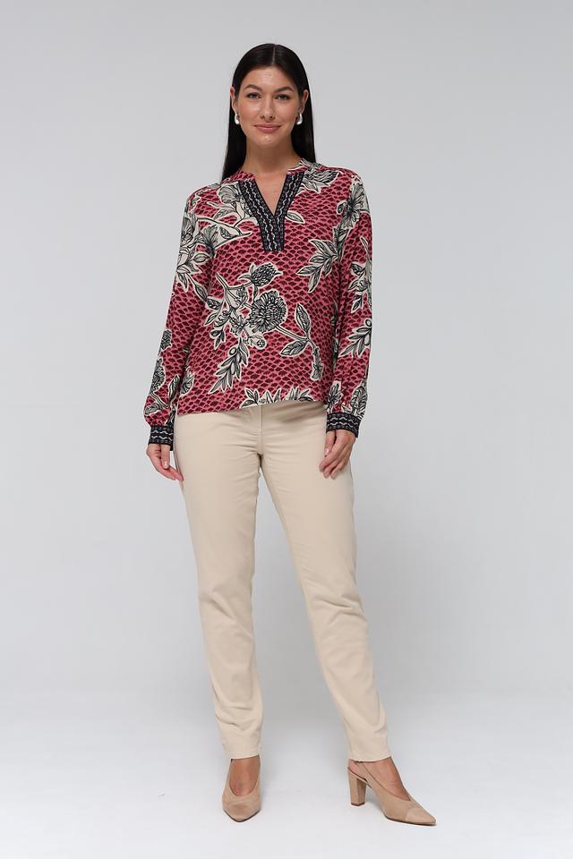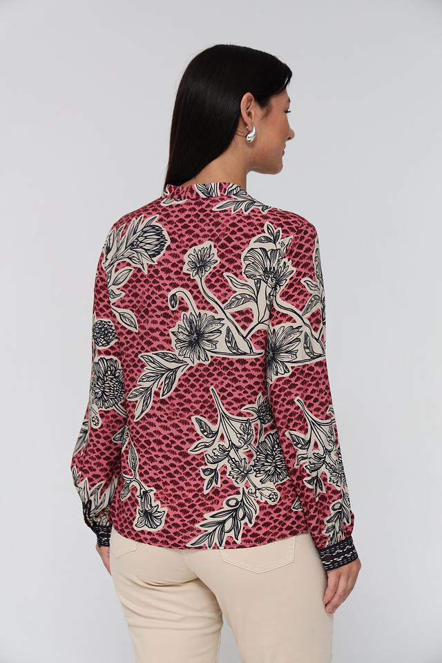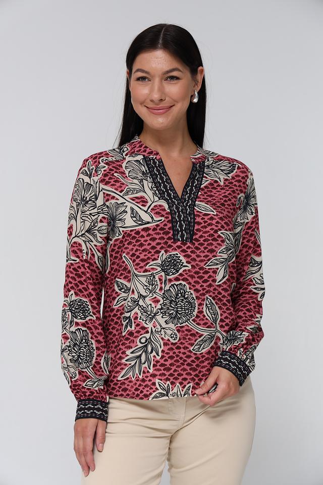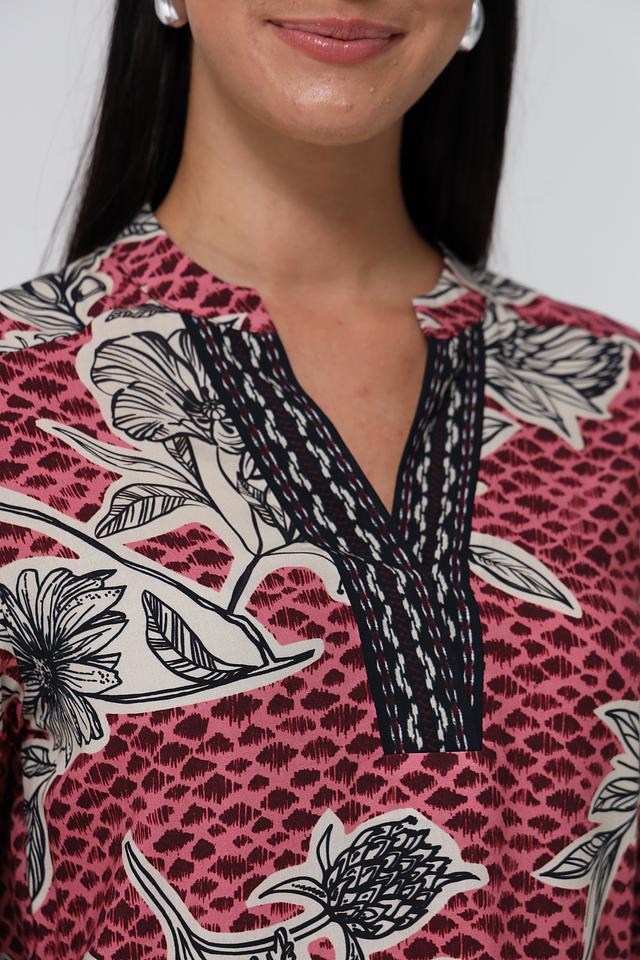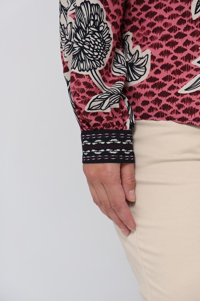 Блуза имеет свободный крой, длинные рукава с манжетами и V-образный вырез горловины, который обрамлен декоративной черной вставкой. Основной цвет блузы – насыщенный розовый, а яркий цветочный принт добавляет ей неповторимости и женственности.