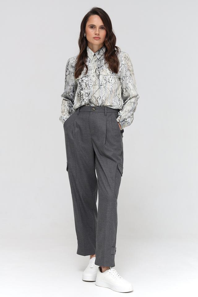 Блуза имеет классический крой с длинными рукавами и отложным воротником. Застежка выполнена на пуговицы в тон ткани. На груди расположены накладные карманы с клапанами, добавляющие блузе функциональности и стиля.